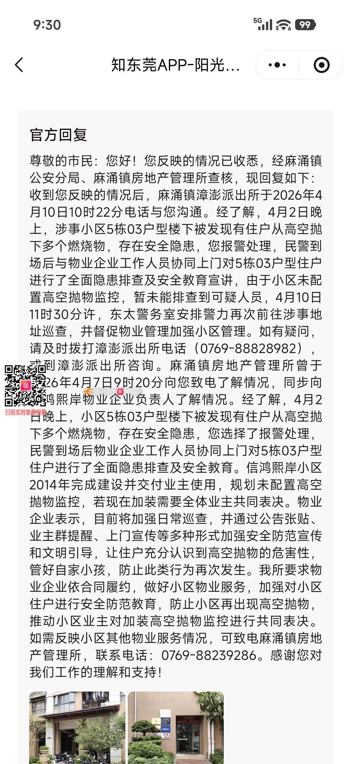 麻涌房管所对信鸿熙岸高空抛燃烧物回复无时限、无纠正