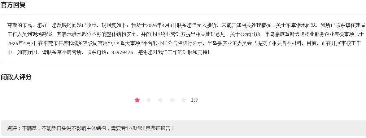 我是半岛豪庭小区业主,现再次反映3、4栋负二层地下停车场地板持续渗水的严重问题。此前,我们已多次投诉,但房管所回复仅凭口头表示“渗水部位不影响整体结构安全”,未提供任何专业依据。这种轻率回应无法消除业主对水土流失、地基掏空及楼栋倒塌风险的深切担忧。 我们坚决要求:贵局立即责成专业检测机构对渗水问题进行全面勘察,并出具正式鉴证报告,明确楼体安全风险。口头保证毫无公信力,必须通过权威数据证明结构安全性,否则整改措施无从谈起。盼速复并行动!谢谢!