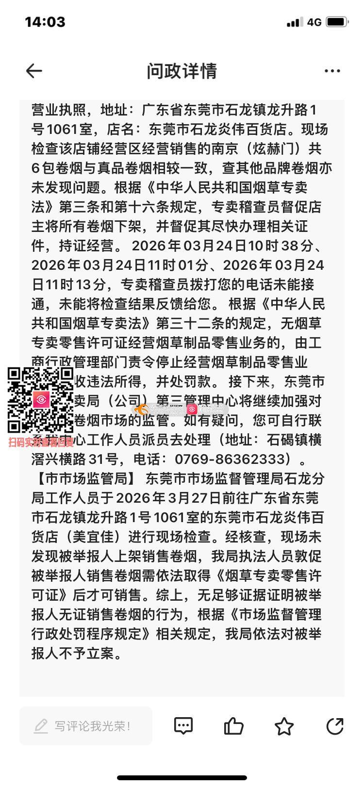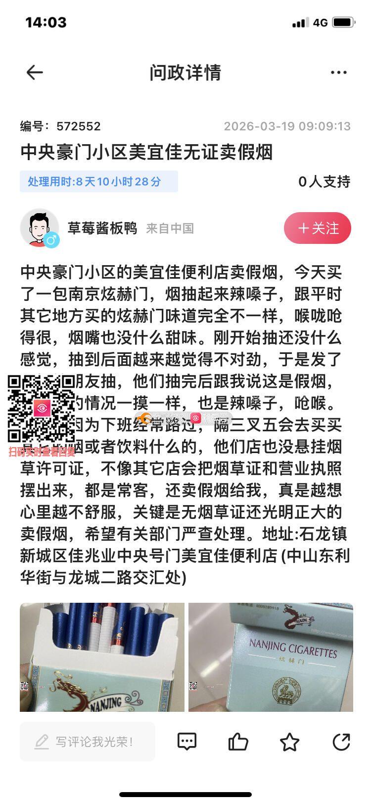 之前在中央豪门美宜佳便利店买的南京炫赫门发现是假的,后面发起投诉,投诉编号:572552,烟草专卖局回复到现场核实,经核查该店存在无烟草许可证销售卷烟问题。2026年3月27日市场管理局却回复该店无上架销售卷烟,证据不足,不予处罚立案。前面烟草局已到店核查证实该店存在无证销售卷烟,并且烟草局现场执法时也会有执法仪录像,在已被烟草局证实的情况下不知何种原因市场管理局却说没有问题。