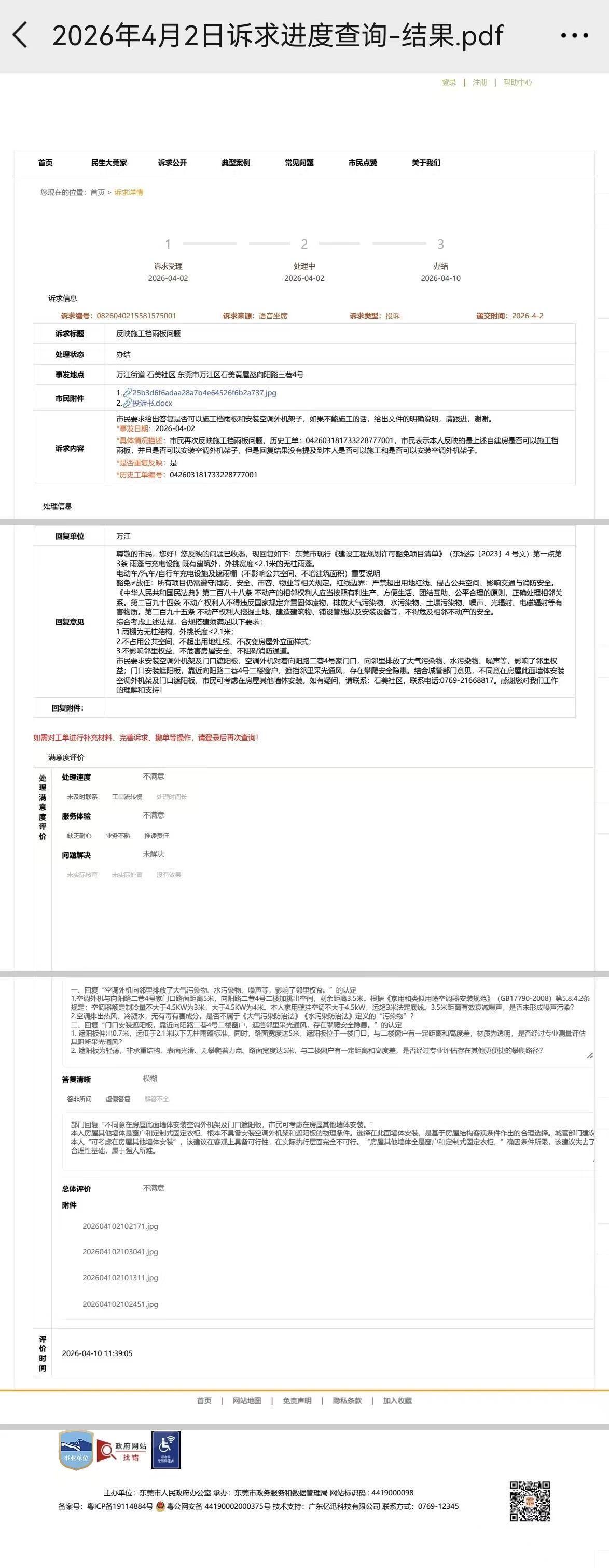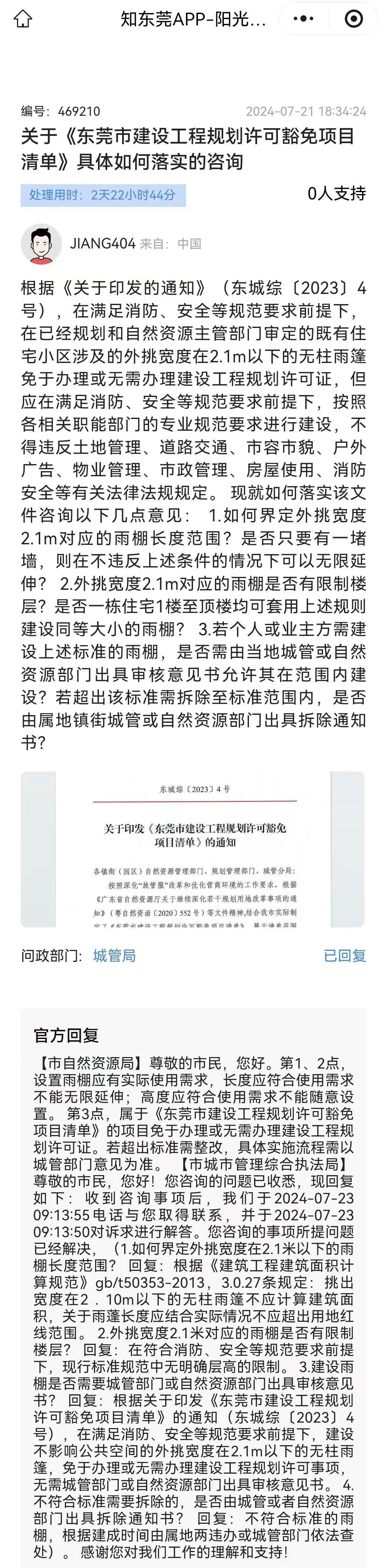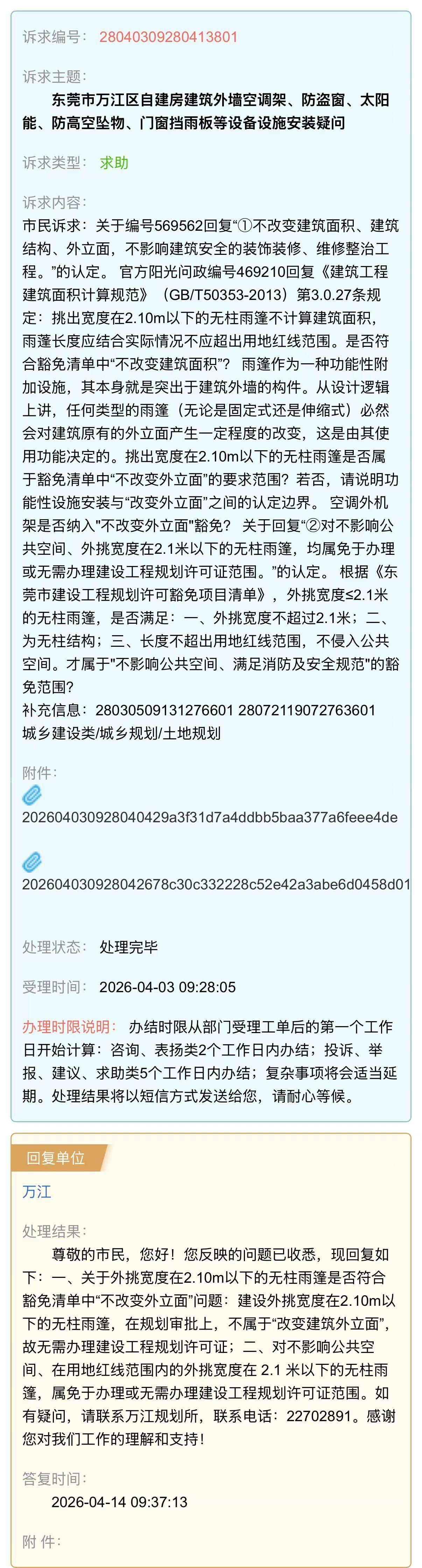 东莞多雨炎热,遮雨板和空调是市民基本生活保障,关乎千家万户民生权益,若部门不经检测、评估,仅以“污染物”“噪声”“安全隐患”等笼统理由否决安装,甚至因邻居主观反感导致施工停滞。恳请万江街道重视,督促依法依规处理。 2026年2月12日,产权人在自有自建房施工安装空调外机架及外挑0.7米无柱遮雨板。因邻居投诉,部门处理意见前后矛盾。 2月14日,部门现场称:“固定遮雨板属违建,无规定宽度。但《东莞市建设工程规划许可豁免项目清单》有雨篷这项,”该认定与阳光问政编号469210规范解读相悖。 4月10日,部门回复承认:外挑≤2.1米无柱雨篷属豁免项目,根据阳光问政编号 575483解读,产权人符合相关规定。部门却改以空调外机产生“大气、水、噪声污染物,遮阳板遮挡二楼采光通风,存在攀爬安全隐患”为由不同意安装,建议“在其他墙体安装”。从“固定即违建”到“豁免但不同意”,认定无依据。一、本人家用壁挂空调制冷量≤4.5kW,排出常温热风、冷凝水为普通生活用水,无毒无害,绝非污染物。外机距相邻门口5米,二楼间距3.5米。远超《家用和类似用途空调器安装规范》3米底线。噪音已自然衰减,不构成噪声污染,且外机朝向阳台而非门窗。二、遮雨板外挑0.7米,远低于2.1米豁免标准,材质透明,位于一楼门口,与二楼窗户有高度差且间距不少于3米,部门是否进行专业测量评估认定遮挡采光通风?该板轻薄光滑无着力点,所谓攀爬安全隐患,违背建筑常识,部门是否核查过有其他更便捷的攀爬路径?三、关于 “建议其他墙体安装”。房屋其他墙体为窗户和固定衣柜,不具备安装条件,建议纯属强人所难。部门若能举证违法事实,有权责令整改或拆除;但在缺乏证据时,是否无权仅凭主观判断“不同意”安装?