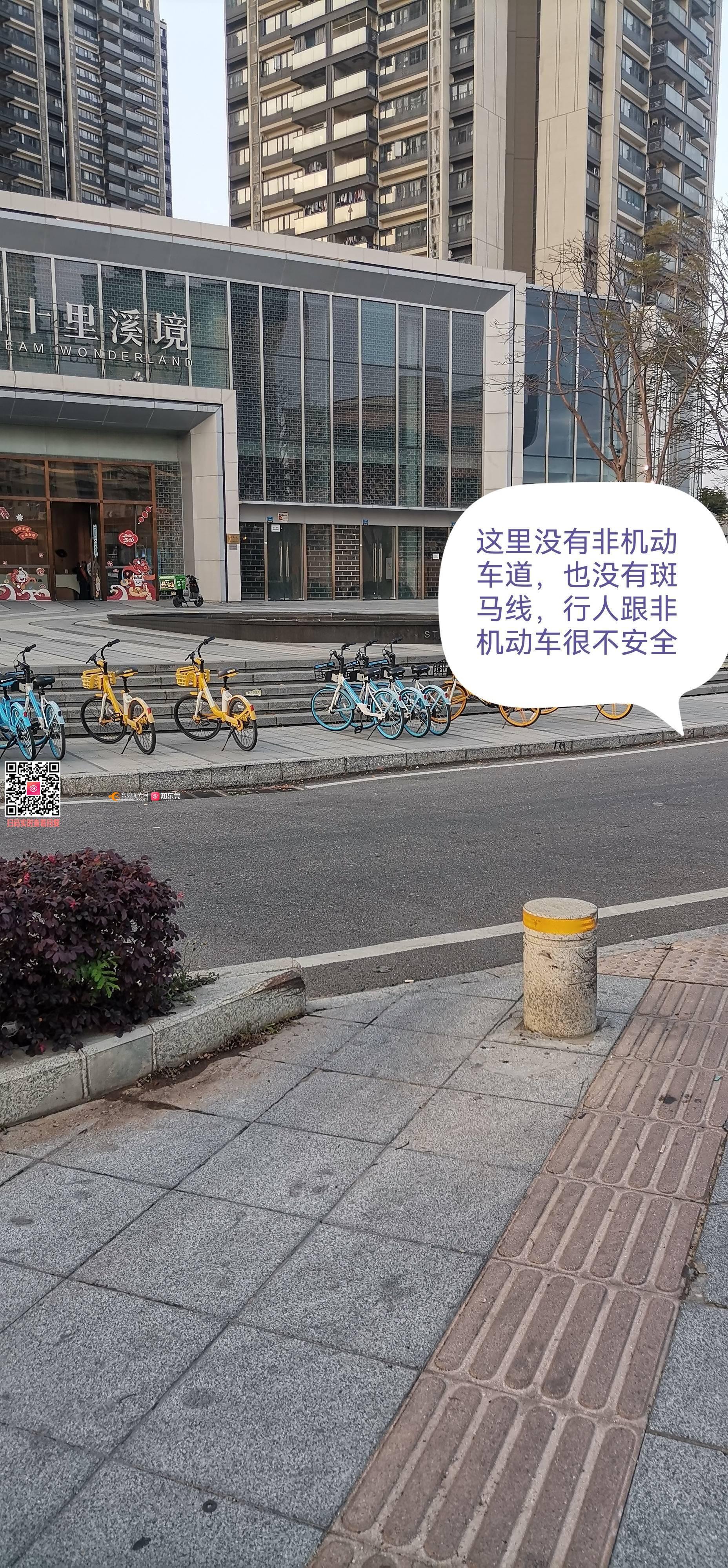 万江十里溪境红绿灯路口,没有非机动车道,行人和非机动车很不安全