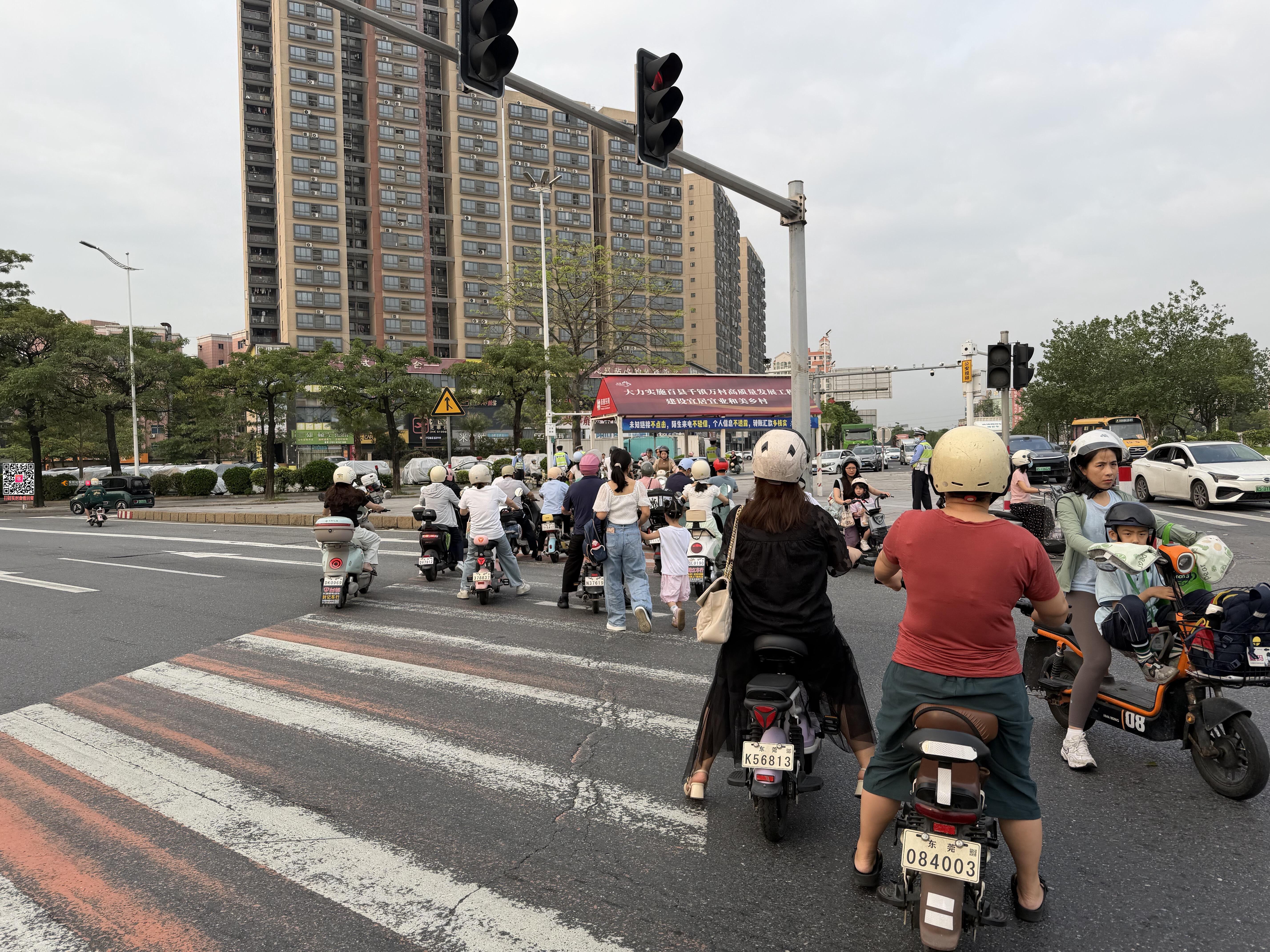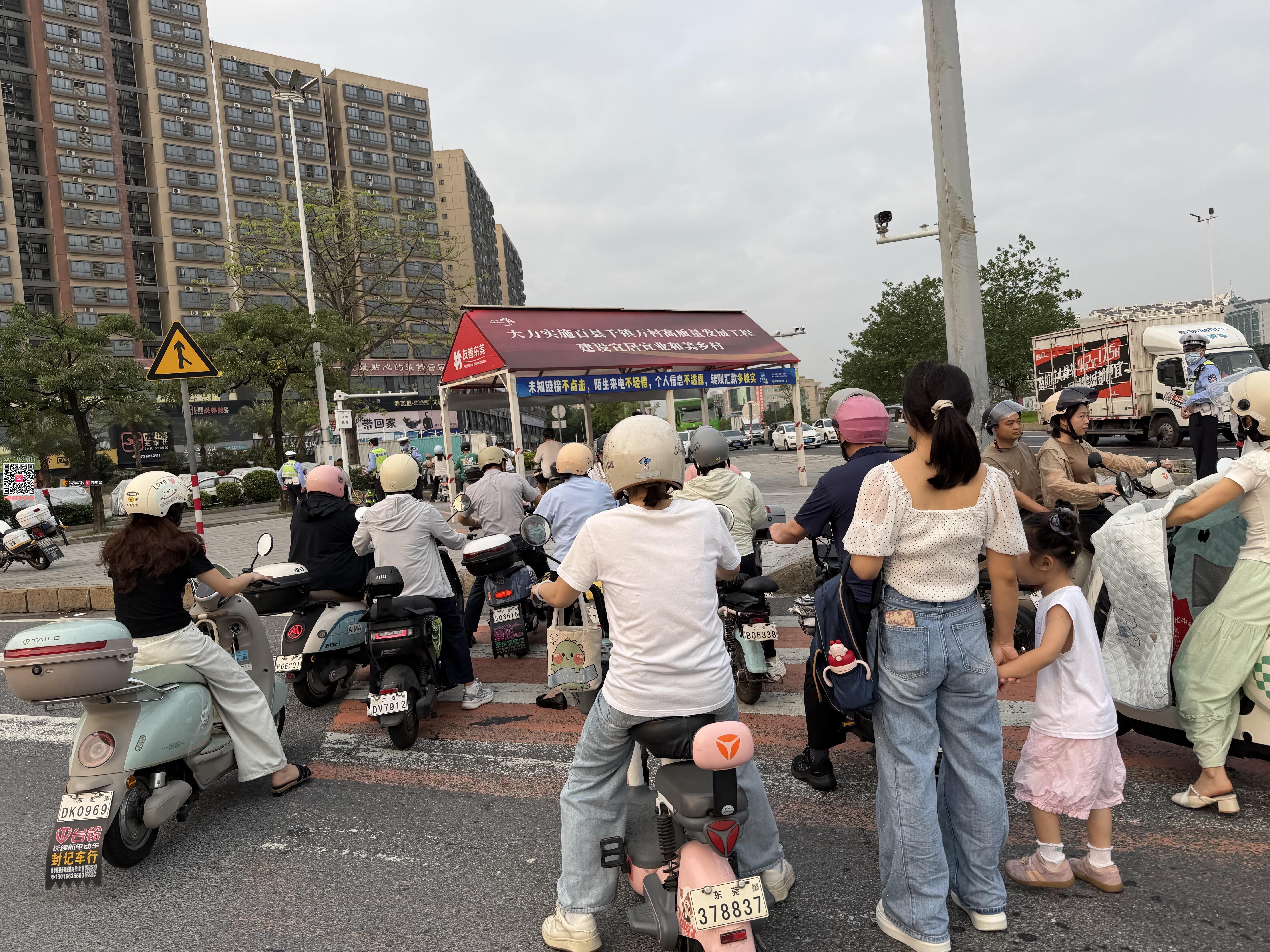 绿灯通行,红灯了还没过去。 诉求:调整通行口,使其能三辆电动车同时通行