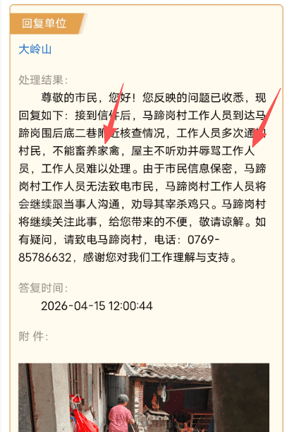 大岭山镇马蹄岗村围后底二巷28号的村民从去年开始就擅自饲养家禽,去年投诉后不了了之。今年三月初鸡的种类从母鸡增加到公鸡后就一直投诉至今,这期间每次都回复村民不听劝阻,村委会会继续关注此事。三月末四月初又增加了许多的小鸡,要发展成养鸡场的样子,现在还没开始正式入夏,但天气也已经慢慢转热,蚊子、蟑螂、老鼠已经到处乱窜,越来越多,真的多到离谱。空气也因为鸡屎问题越来越难闻,下班、放假在家只能紧闭门窗,现在已经不止是晚上睡不了,白天呆着也难受。明明有规定不能饲养家禽,且多次不听劝阻、拒不执行会面临处罚跟强制处理,那为什么政府人员并没有实际行动?每次都只是口头劝阻?