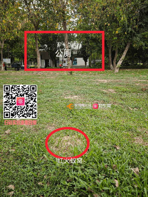 位于东莞生态园月湖公园露营地,公厕前面的二十米处,有红火蚁窝,希望有关部门及时处理
