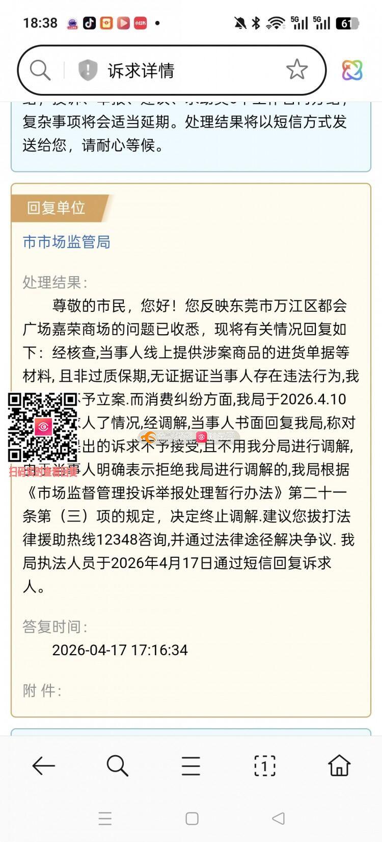 尊敬的市民,您好!您反映的事项【工单编号28041720445537301】已收悉。现回复如下:经核实,您本次反映的事项与热线工单(编号:0326040821593555401)内容重复,【市市场监管局】此前已对该事项作出明确答复:您反映东莞市万江区都会广场嘉荣商场的问题已收悉,现将有关情况回复如下:经核查,当事人线上提供涉案商品的进货单据等材料, 且非过质保期,无证据证当事人存在违法行为,我局决定不予立案.而消费纠纷方面,我局于2026.4.10联系诉求人了情况,经调解,当事人书面回复我局,称对消费者提出的诉求不予接受,且不用我分局进行调解,由于当事人明确表示拒绝我局进行调解的,我局根据《市场监督管理投诉举报处理暂行办法》第二十一条第(三)项的规定,决定终止调解.建议您拔打法律援助热线12348咨询,并通过法律途径解决争议.我局执法人员于2026年4月17日通过短信回复诉求人。根据《东莞市政务服务便民热线管理办法》第十条第(七)项规定,对正在办理或已办理完毕、且无新情况或新理由重复提出的同一诉求,热线不再重复受理。感谢您对热线工作的理解与支持!