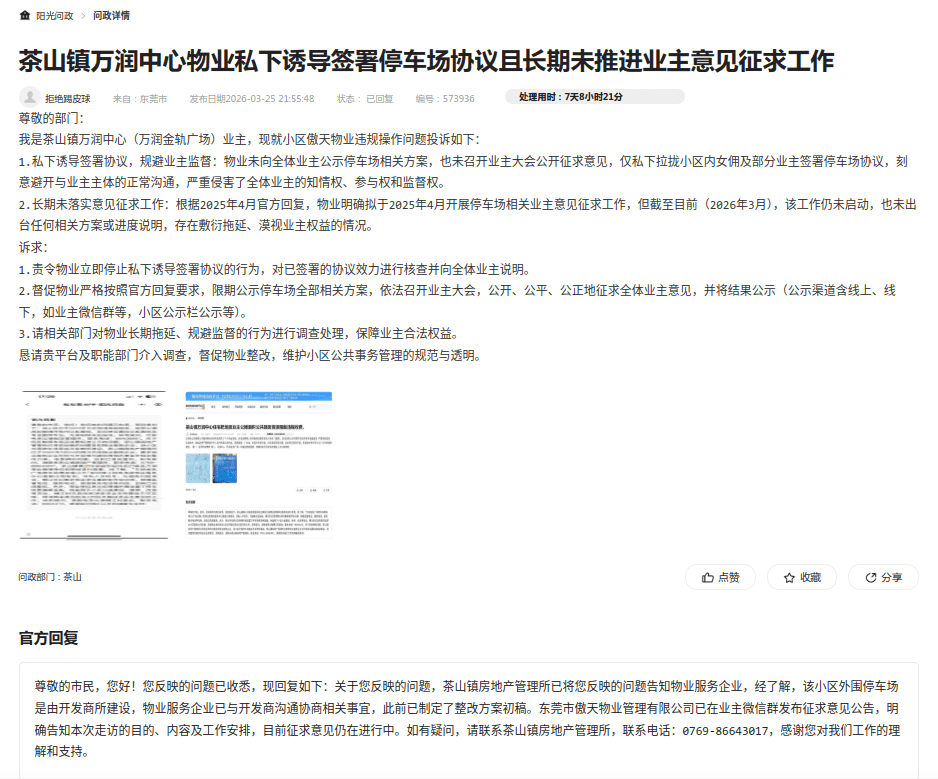 关于茶山万润中心物业(傲天物业)在停车场收费管理中程序违法、漠视业主权益的再次投诉