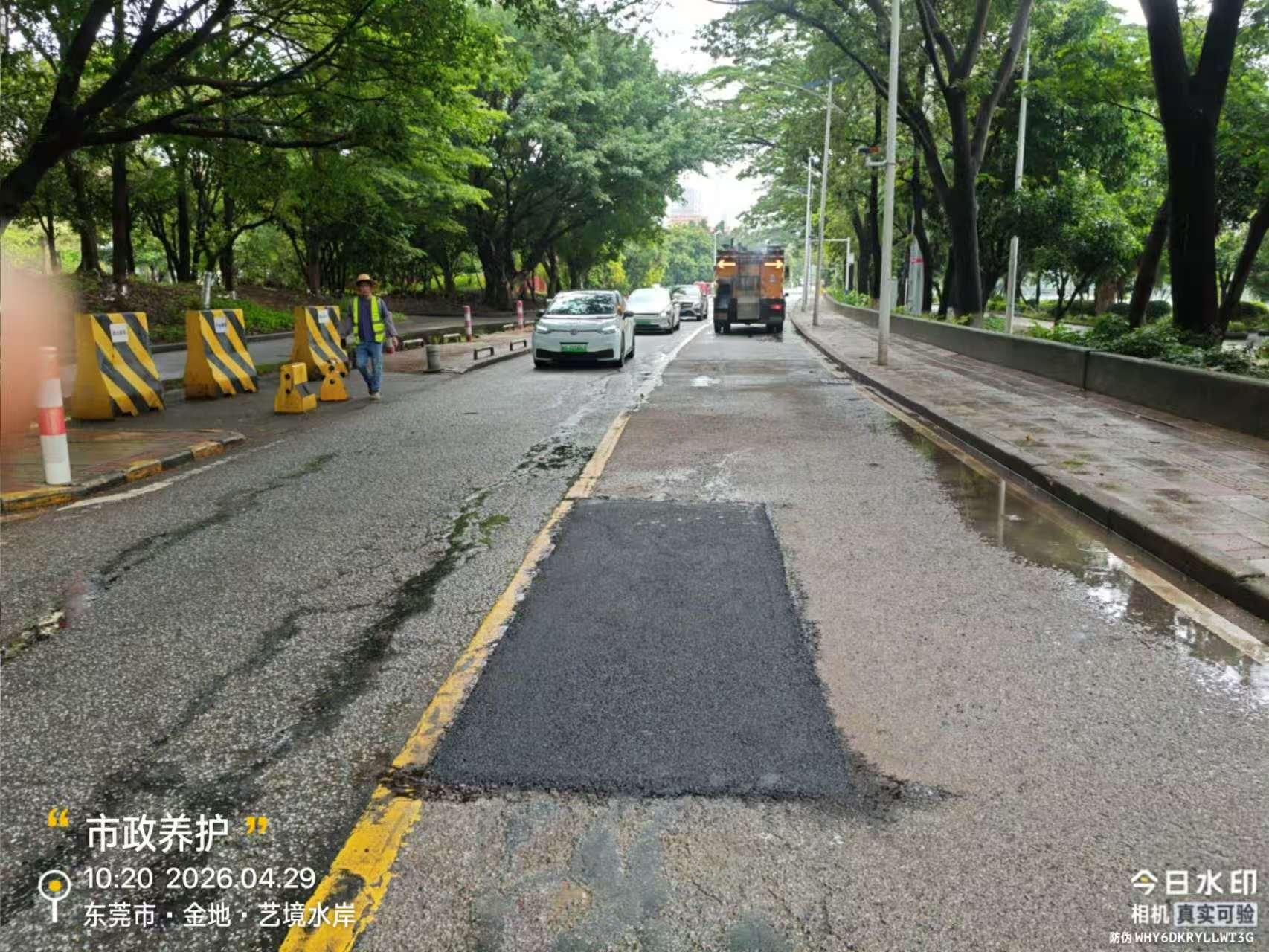 尊敬的市民,您好!您反映的问题已收悉,现回复如下:我分局及时安排工作人员到场处置,于2026年4月29日完成万江街道金地艺境水岸别墅靠河边的坑洼路面修复工作,及时消除道路通行隐患,切实保障车辆通行安全。如有疑问,市民可以拨打万江城管分局电话0769-23380442进行反映,感谢您对我们工作的理解和支持!