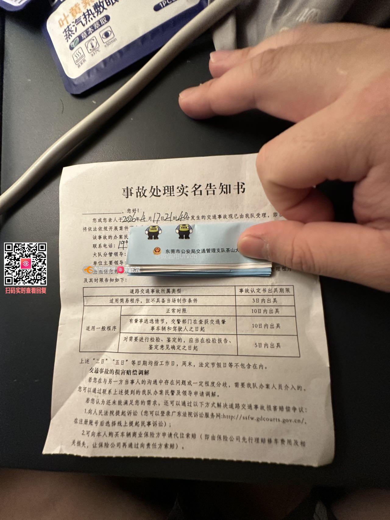 2026年4月17日晚上21:40分,在茶山国际布料辅料交易中心(广东省东莞市建民一路与秋源路交叉口东北方向186米左右)的红绿灯发生了一起交通事故,当时也报警了,对方在直行车道左转弯碰到我的车就逃逸了。当时也立马报警,大约21:42分左右报警。一直处理到2026年4月18日01:46分,都没有找到车主和车辆!!!然后交警叫我回家等通知。一台黑色奥迪。请问下,现在的监控摄像头调查一辆车三个多四个小时都查不出来 吗!???现在刮到车,三四个小时都找不到!如果是人呢????请问下这样子的办事效率让受害者怎么安心?!请问下到现在早上09:28分,10个多小时的时间都没查出来,是正常合理的工作处理方式吗?