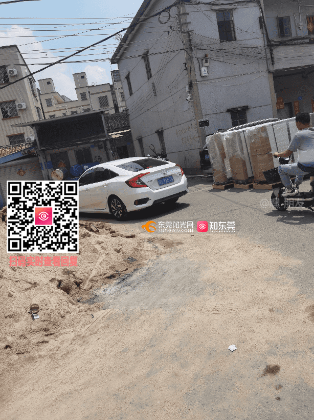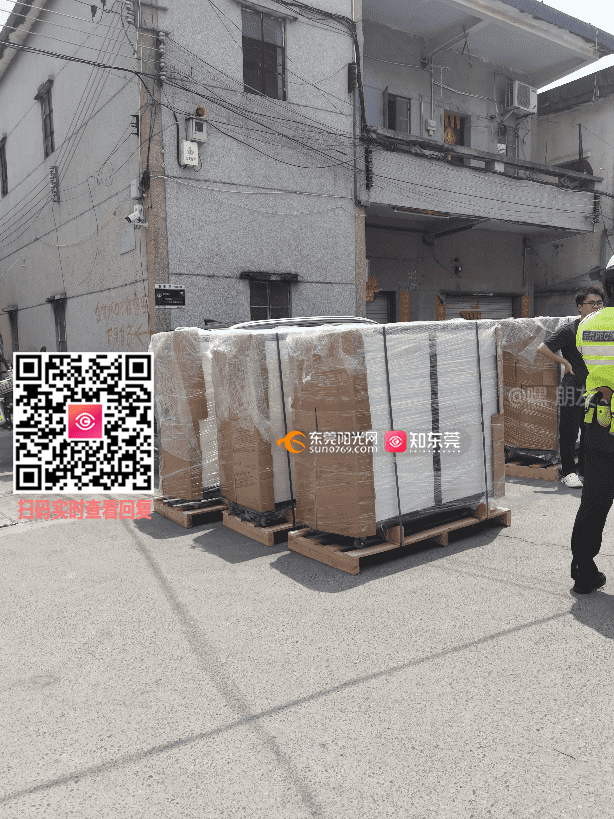 道路两边停满车辆,正常难以通行。以及道路上摆满工厂货物。