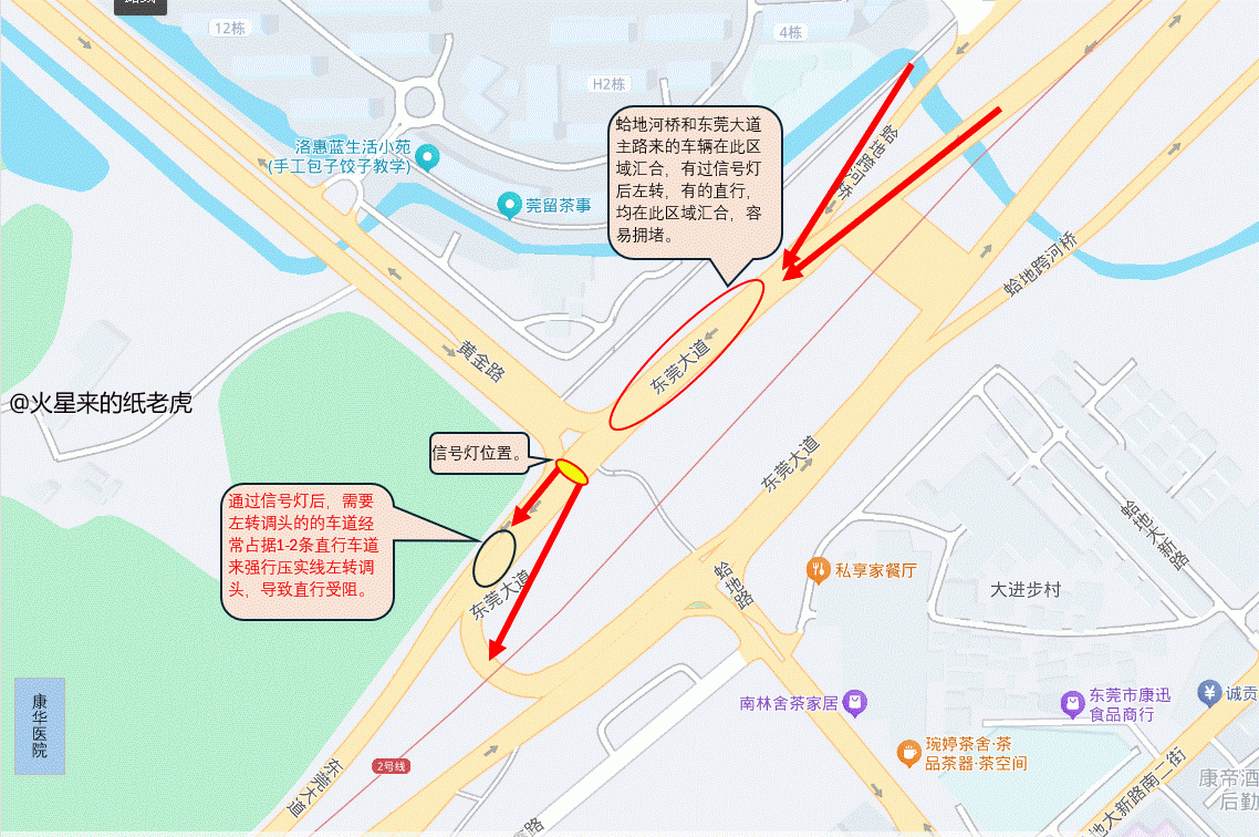 东莞大道与黄金路交叉拥堵 1.过交通信号灯前,两条路交汇,容易造成拥堵,这个很难避免我能理解。 2.南向过交通信号灯后,左转调头的车辆在直行道上占道左边调头,严重时三条直行道被占据两条道,此行为是无素质司机导致,需加强管理。 3.类似情况还有很多,每个主副路切换点,只要前面稍微堵车就很多车辆不守规则,强行压实线,压导流线插队(上下班高峰期天天见),让安心排队的人更慢,长此以往谁还甘愿做守规矩的司机? 安全出行,人人排队,才能让东莞更文明。