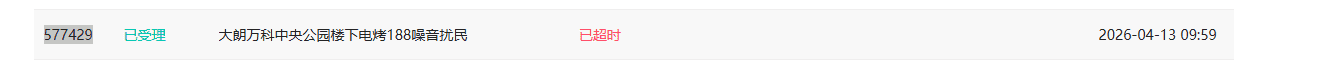 编号577429,为什么超时不处理。大朗万科中央公园楼下电烤188夜间整夜营业,消费人员醉酒大声喧哗,大吼大叫。桌椅摆在公共区域,制造噪声和垃圾污染附近环境