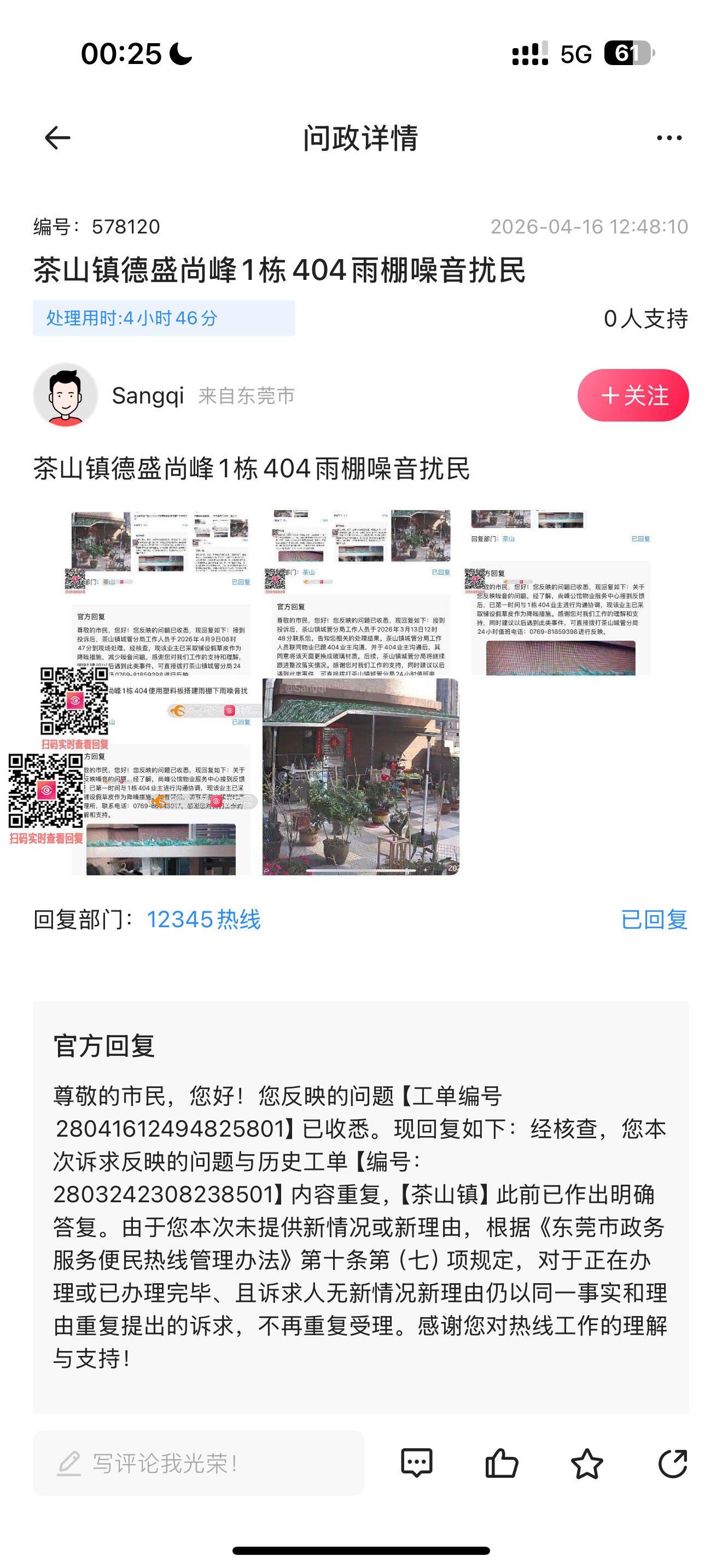 茶山镇德盛尚峰1栋404雨棚噪音扰民,何为历史工单重复?为何重复仍未处理?本人已经多次回复草皮没有任何作用,答应更换玻璃材料为何一直为安排落实?一直虚假回复,我会继续投诉到处理为止同时投诉你地茶山城管局