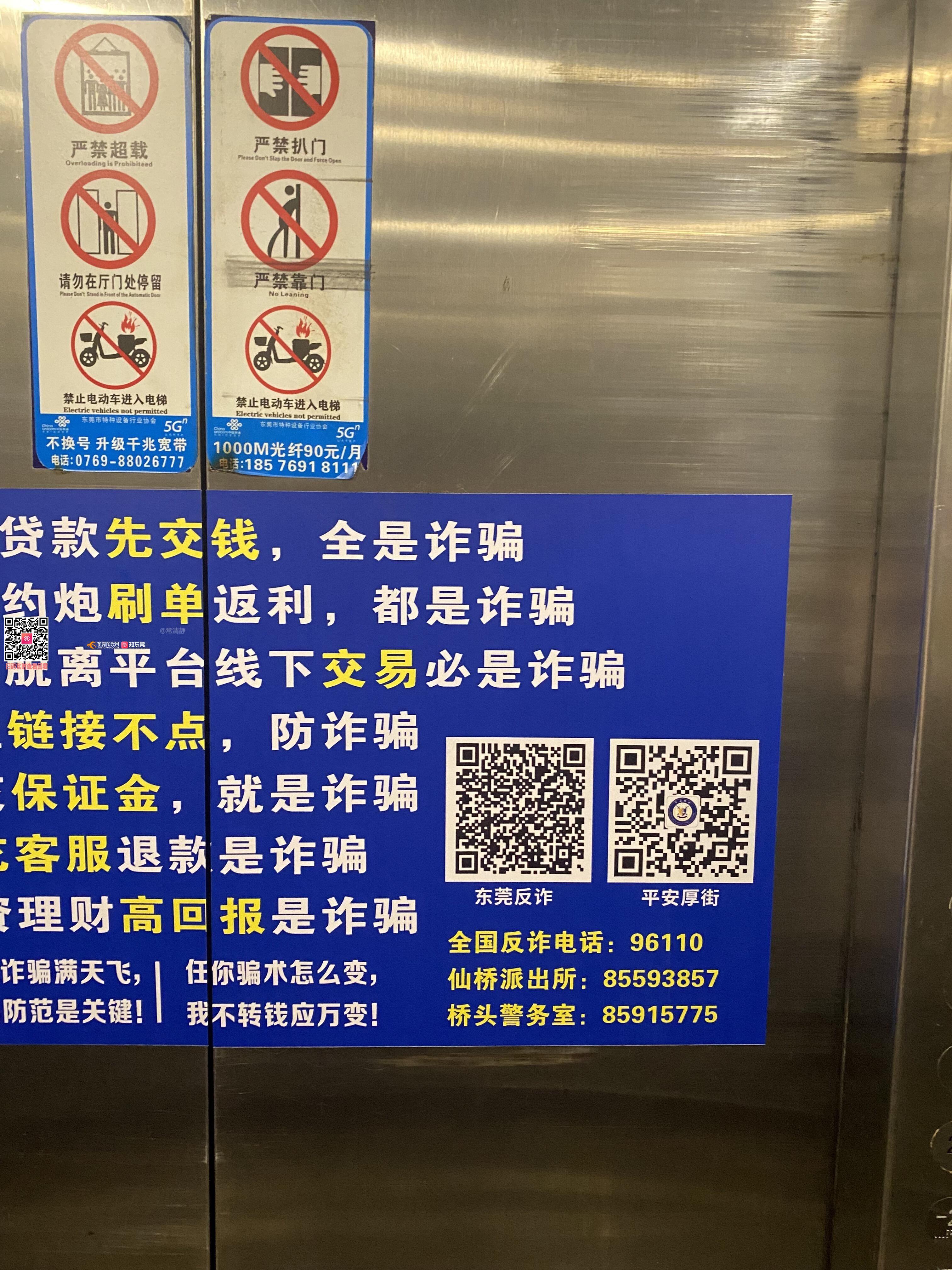 厚街仙桥派出所在君汇华庭小区每个电梯里里外外贴满反诈通知的贴纸,三个电梯门里面和外面,和一楼墙壁,过度张贴大面积反诈通知,极度影响观感,令人心情烦躁,小区物业向派出所反馈过拒不整改,派出所不接受群众意见非要在电梯里里外外大面积张贴通知