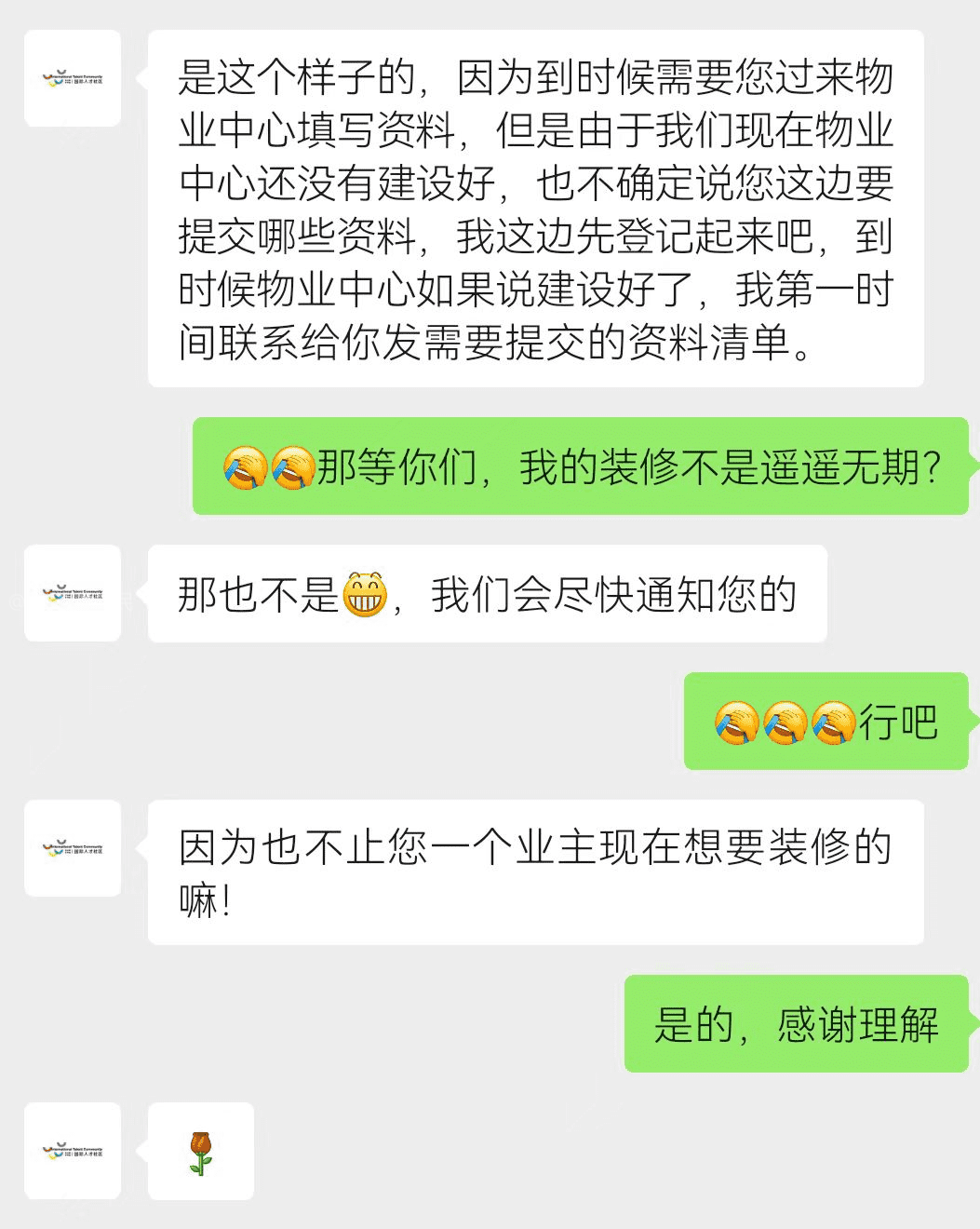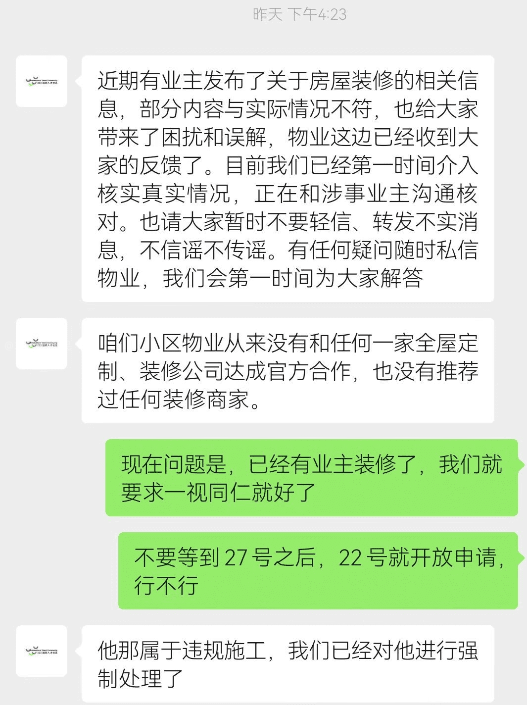 尊敬的相关部门领导: 您好!我是松山湖科学城国际人才社区(以下简称“该小区”)的一名业主,现向您反映小区物业在装修管理中存在的前后承诺不一、执行标准双标、侵害业主合法权益的问题,恳请您介入协调,督促物业正视业主合理诉求,保障我们正常的装修权利。 一、事件经过与问题详情 1. 交付前明确承诺,误导业主规划工期 早在房屋交付前,我多次向小区“客户大使”咨询装修进场时间,对方明确答复:只要本楼栋交付期结束,即可办理装修申请并进场施工(附聊天记录截图1、2)。我基于此承诺,提前安排了装修设计、施工队预约、定制家具排产等所有准备工作,计划在本楼栋交付(4月22日)后立即进场施工,以保障后续入住计划不受影响。 2. 交付后物业突然改口,设置不合理限制 4月17日小区启动集中交付后,物业突然推翻此前承诺,告知业主需等待整个小区集中交付完成(4月27日)后,才开放装修资料提交通道,且最快也要五一节后才能进场施工(附聊天记录截图4)。同时,物业以“物业服务中心未建设完成、装修审批流程未准备好”为由,拒绝为已完成交付的业主办理装修申请,无视我们的工期紧急诉求(聊天记录截图3、4)。 3. 执行标准严重双标,商家违规装修却放任不管 更让所有业主无法接受的是,物业对业主和第三方商家采取了完全不同的管理标准:- 一方面,物业声称业主提前装修属于“违规施工”,对已进场的业主采取强制处理措施(附聊天记录截图5); 另一方面,多家全屋定制商家却早在4月17日前就已进入小区施工,甚至公开在抖音、小红书发布“小区首个样板间4月20日正式开放”的宣传视频,视频中样板间已基本装修完成(附聊天记录截图6、商家宣传视频截图7、8及现场施工照片9)。 同一片小区内,业主提前装业主提前装修被定义为“违规”,商家提前施工却能畅通无阻,物业的双标行为严重伤害了业主的信任,也违反了公平公正的管理原则。