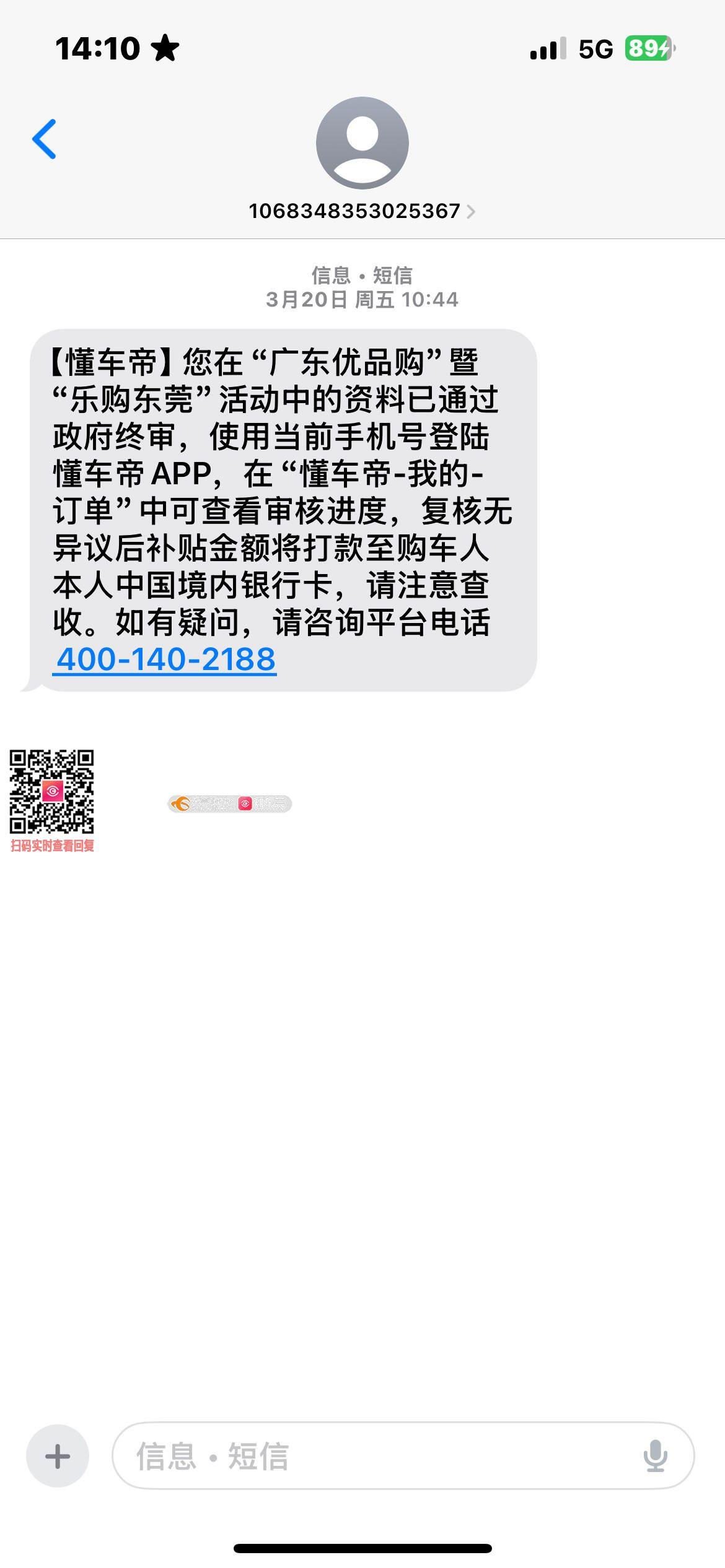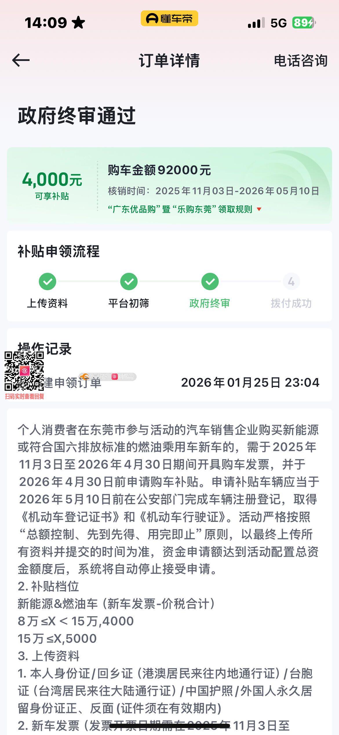 尊敬的市民朋友:您好!您反映的问题已收悉,我局于2026年4月22日与您联系,现回复如下:经查,您的申请目前已审核通过,下来我局需与市交警支队和市税务局核验有关资料,核验无误后将公示补贴名单并进入资金拨付阶段。目前我局正在抓紧开展审核、拨付等工作,请耐心等待结果,暂无具体到账时间。如有疑问,可于工作日8:30-12:00,14:00-17:30致电东莞市商务局市场规划与建设科,联系电话:0769-22997380、22993529。感谢您对我们工作的关注和支持!祝您工作顺利,生活愉快!