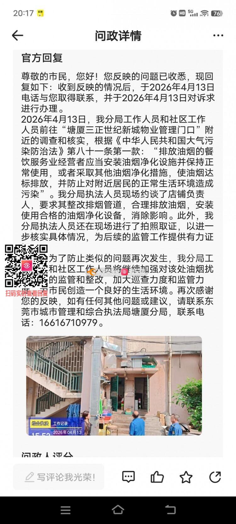 2026年4月10投诉饭店油烟扰民,4月13日相关部门去现场查看,并回复说督注饭店整改。今天是2026年4月21日,现场还是没有任何整改,油烟味还是照样刺鼻,窗户不能打开。物业只知道收钱,没有任何反应,难道就没有人管吗?,就这样任由他们乱排放吗?希望有关部门加大力度,彻底整改!