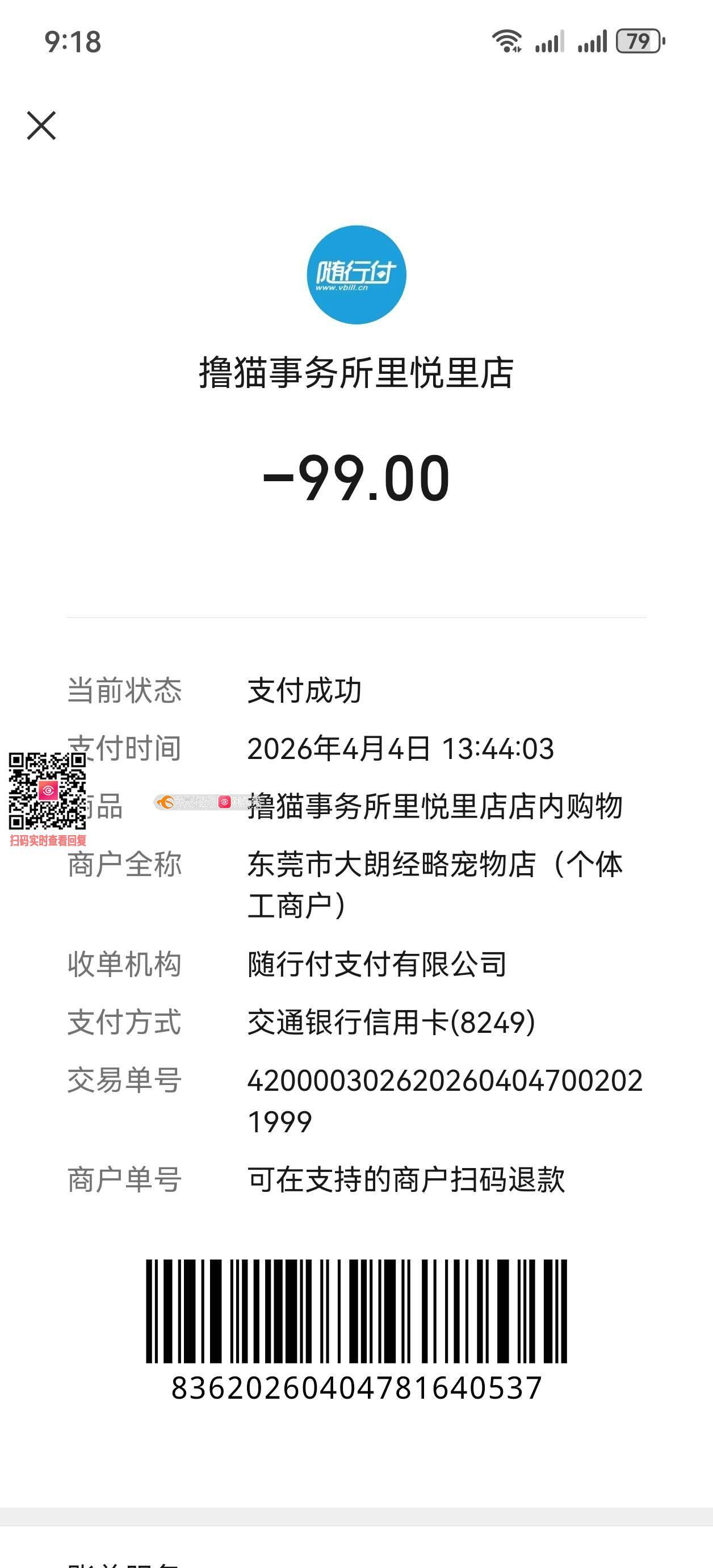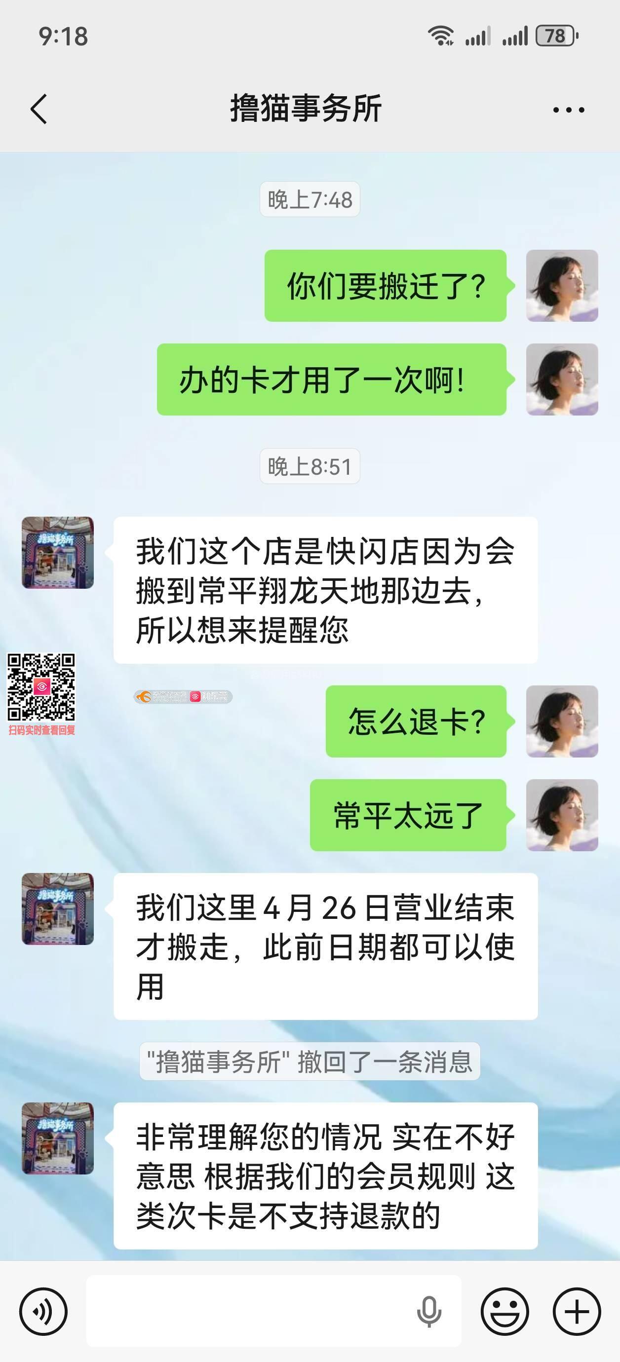 2026年4月4日在大朗里悦里撸猫事务所办了一个99元5次的卡,只用了一次,今天商家突然说店铺地址搬迁,卡内金额不退。