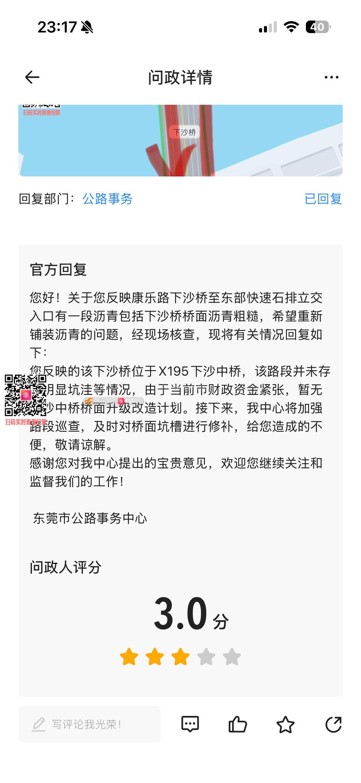 康乐路下沙桥段路面破损很严重啊,前期反馈过一次,得到的回复说没问题,也不知道是你们标准低还是我标准高啊,这小段沥青路明明很破,坑坑洼洼,修补的一块块的,沥青也非常粗糙,来回也就两百多米的路,重新铺一下沥青能费多少钱啊?搞不懂。