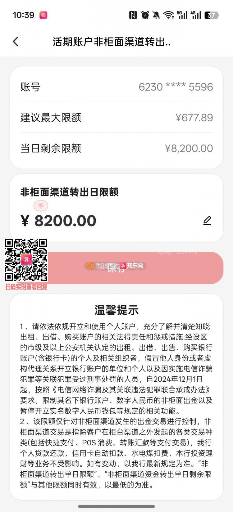 投诉东莞农商行随意限制我的非柜面转账额度:1.根据《商业银行法》第二十九条明确规定,商业银行应当保障存款人的合法权益不受任何单位和个人侵犯,存款自愿、取款自由。2.东莞农商行却打着反诈骗的旗号,侵犯我存取自由的权益!《反电信网络诈骗法》第十五条,只是要求银行做好风险排查尽职调查,并没有授权银行无凭无据、没有公安涉案依据,就随意压低正常合法账户转账额度。3.反诈风控是合理核查,不是他们曲解法律、一刀切限制我正常合法资金使用。我账户无任何涉诈异常,恳请贵局监督他们立即将我转账限额恢复至正常状态。