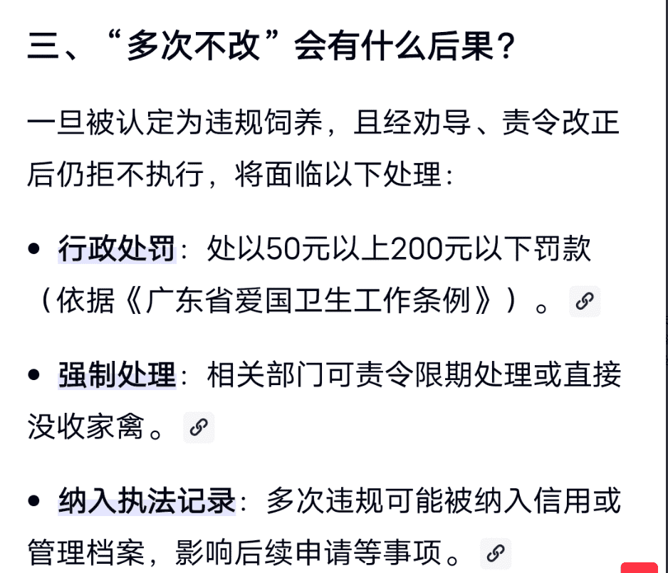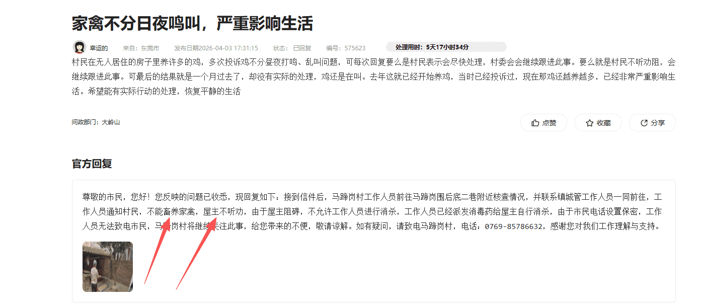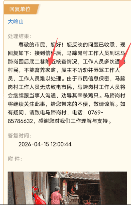 大岭山镇马蹄岗村围后底二巷28号的村民从去年开始就擅自饲养家禽,去年投诉后不了了之。今年三月初鸡的种类从母鸡增加到公鸡后就一直投诉至今,这期间每次都回复村民不听劝阻,村委会会继续关注此事。后来就改为回复:现场已找到当事人教育其自行整改,会继续安排人员加强跟踪监管。可直至现在,这个问题还是毫无改变,公鸡依旧日夜不分的在叫,母鸡白天也加入鸡叫环节,三月末四月初又增加了许多的小鸡,那小小的一个地方已经有上百只鸡,这是要发展成养鸡场的样子。现在还没开始正式入夏,但天气也已经慢慢转热,蚊子、蟑螂、老鼠已经到处乱窜,越来越多,真的多到离谱。空气也因为鸡屎问题越来越难闻,下班、放假在家只能紧闭门窗阻挡气味。现在已经不止是晚上睡不了,白天呆着也难受。明明有规定不能饲养家禽,且多次不听劝阻、拒不执行会面临处罚跟强制处理,那为什么政府人员并没有实际行动?没有强制去处理?每次对方口头答应了就算,没有实际去处理也不管,下次投诉后依旧是回复已经劝阻村民,对方已承诺会如何如何整改。已经连续不间断的投诉了近两个月,近两个月的劝阻难道不算是经劝导、责令改正后仍拒不执行吗,如果算为什么一直不强制处理那些上百只鸡?