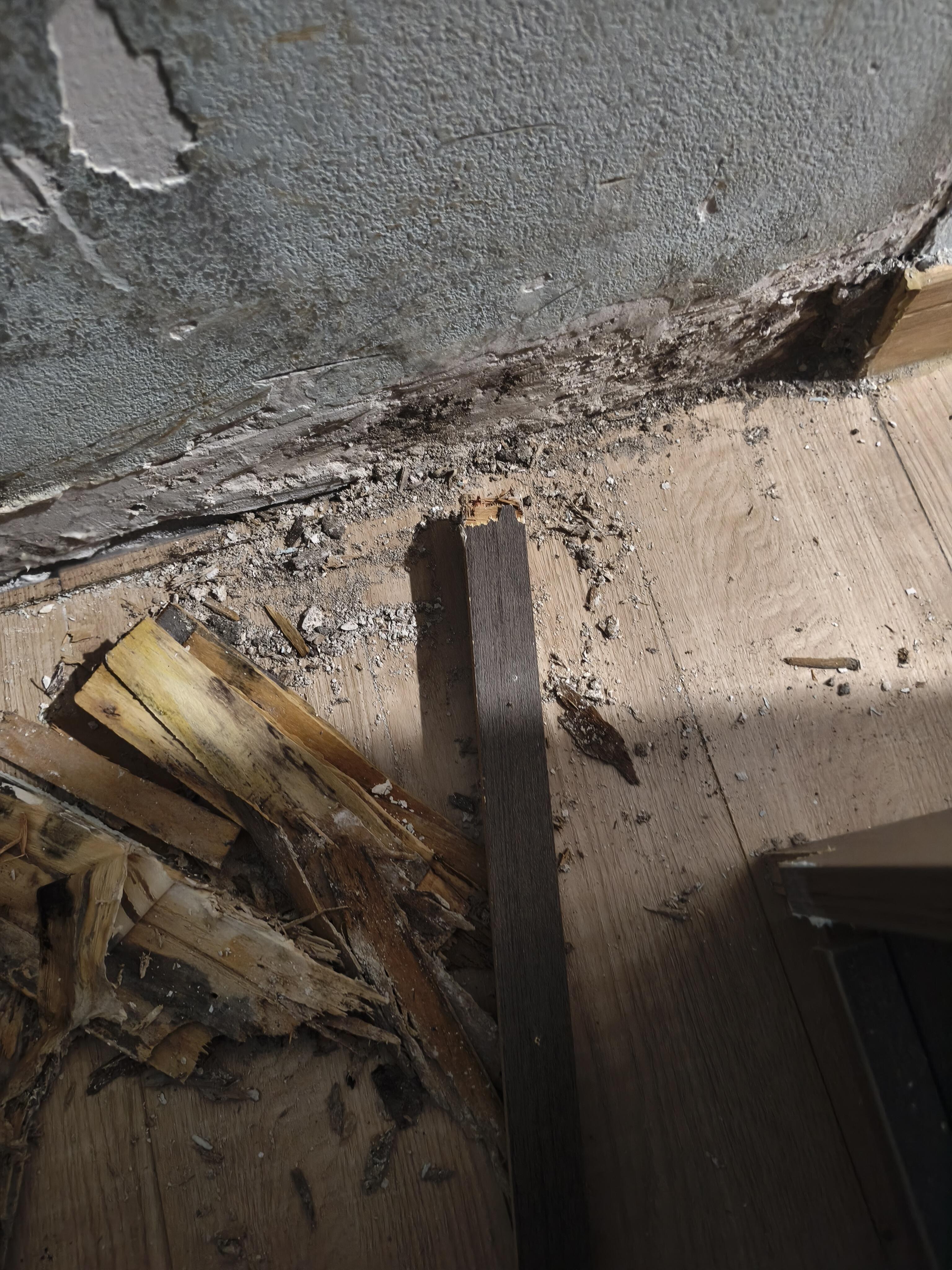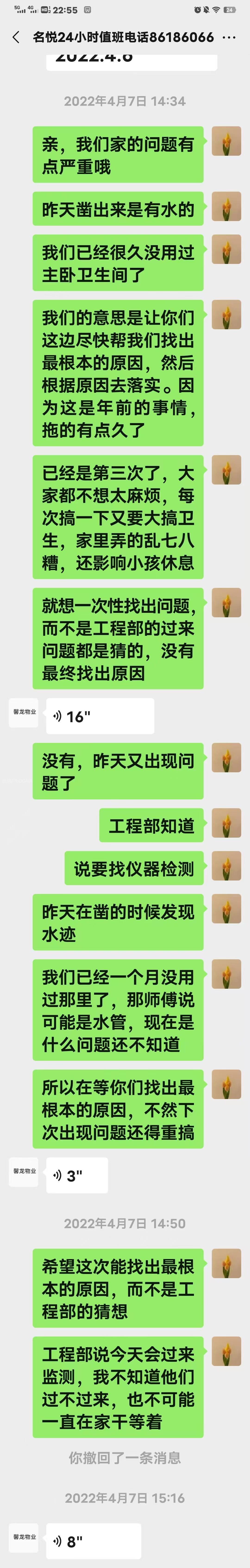 2022年由于我家两个卫生间渗水,致使主卧和儿童房墙面的漆脱落、起泡(在保修期内),我要求把两个卫生间的地板全部挖开,彻底做好防水。但是,腾龙地产开发商和物业只说是两个卫生间淋雨板的问题,极力开脱,口头保证,出于信任我姑且相信了他们的想法,就没按我的要求处理。渗水严重的位置由于装了柜子,紧紧贴住了柜子,一直看不到。2026年2月,由于物业管理不当,主管道导致我家的地漏反水,导致我家损失惨重(三个房间木地板翘边,三扇木门脚胀,木头家具被水泡)。更换木地板时拆开了柜子,机缘之下发现2022年那次同一墙面仍出现漆脱落、起泡,且更严重(保修期5年,刚过)。现在,要求腾龙地产开发商和物业做好上次没做好的卫生间防水,腾龙地产开发商和物业以过保质期为不当理由拒绝。
