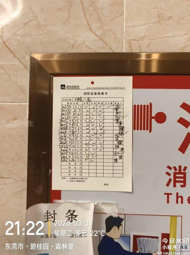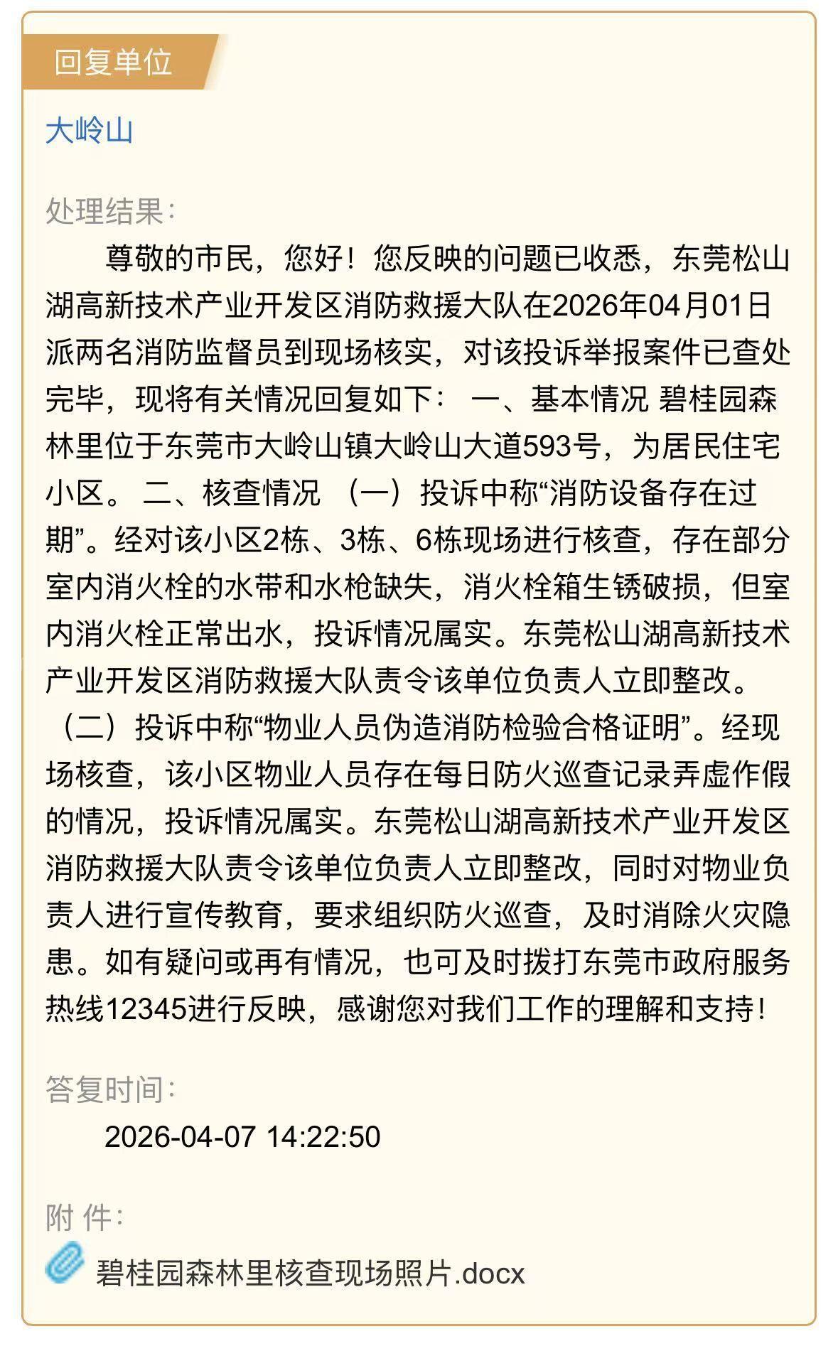 本人是东莞碧桂园森林里小区的业主,现就本小区碧桂园物业服务有限公司长期不作为、虚假履职,放任消防设施失效,漠视全体业主生命财产安全一事,正式向贵部门实名举报,恳请消防救援、住建等相关部门立即介入调查,依法严惩违规行为,责令物业限期整改,切实筑牢小区消防安全防线。 3月31日,我和邻居们发现,6栋一楼的消防箱被白蚁严重蛀空,箱体破损、部分无法开启,内部水带、水枪缺失或老化,完全丧失灭火功能。2栋、3栋、6栋、7栋等多处消防栓水带与接口分离,积灰锈蚀,形同虚设。但物业张贴的《消防设备检查卡》不仅将失效设备标为“合格”,甚至提前签好2026年4月1日的巡检记录,属伪造台账、弄虚作假。 碧桂园物业作为消防责任主体,未履行巡检职责,反而伪造记录欺骗业主、逃避监管,已严重违法,漠视全体业主生命安全。 为此,本人郑重提出以下诉求:一是恳请相关部门从严查处物业虚假巡检、伪造台账、不作为等行为,公示处罚结果;二是责令物业立即全面排查,限期更换失效消防设施,彻底整改隐患;三是要求物业公开巡检台账和整改方案,定期向业主公示进度;四是要求物业就其违规行为向全体业主书面道歉。 以上诉求,恳请继续公开回复,谢谢! 4月7日,官方12345回复东莞松山湖高新技术产业开发区消防救援大队已责令该单位负责人立即整改,但截止目前,业主未看到物业任何具体整改行动,业主服务群也无整改前后情况对比和同步。恳请相关部门介入调查,让整改行为落到实处,保障广大群众的生命安全。