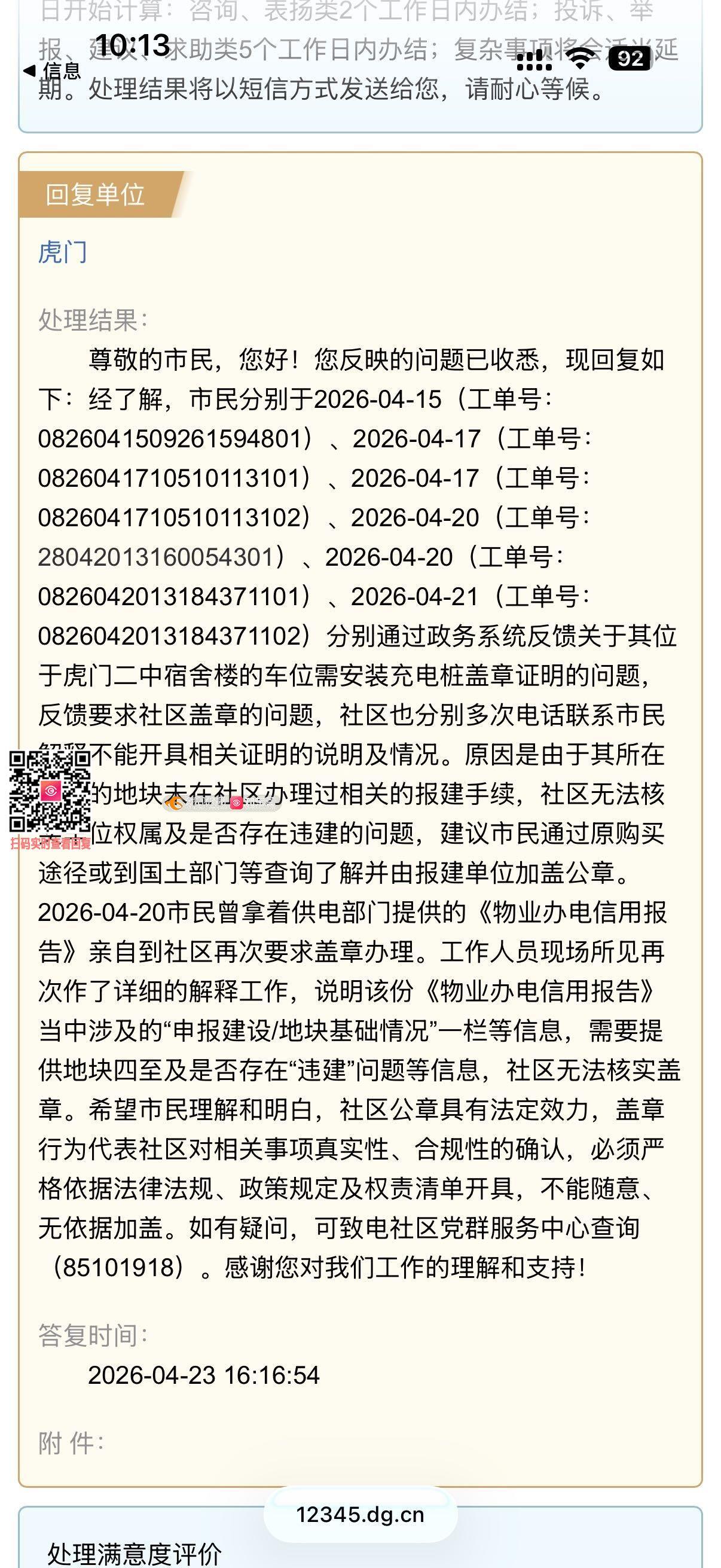 本人六次通过12345政务平台提交盖章申请,均被社区驳回。针对社区2026年4月23日的答复进行正式投诉与逐条反驳,要求社区逐项出示政策依据,同时要求虎门镇政府对相关硬性规定作出公开书面解释,绝不接受敷衍搪塞。 其一,社区以地块未报建、无法核实权属及违建为由拒绝盖章,理由完全不成立。该宿舍楼属于教育局国有公立福利公房,距今已有数十年,社区长期属地管辖,对地块属性与住户情况完全知情,不存在无法核实的理由。本人仅在自有车位安装自用充电桩,未改动建筑主体,也不存在违建行为,社区以此拒绝办理,本质就是履职懈怠与刻意推诿。 其二,社区无视供电局官方规则,私自增设办事门槛。我提交的办电报告为全市统一制式材料,电网工作人员明确告知,仅需填写居住地址,车位四至可直接填写不详,完全符合审批标准。官方表格也明确标注,不在违建清单之内,仅需社区出具基础意见即可。社区无视办理规范,额外加码要求。 其三,社区谎称依据虎门政府规定,必须提供产权证与红线图方可盖章。该说法没有任何官方文件作为支撑,涉案公房本身无个人独立产权,客观上根本无法提供。我要求虎门镇人民政府作出正式解释,公开出示该项要求的政策文件与执行依据,核实社区是否假借政府名义刻意刁难。省市均明文简化老旧公房充电桩审批,社区行为明显违背便民政策。 其四,社区曲解权责,一味甩锅不作为。本次申请仅需核实车位使用事实,不属于产权确权,完全在社区管理职责之内。社区将本该由政府核查的义务转嫁给群众,指引路径完全脱离现实,属于典型懒政。 诉求如下: 1.要求社区针对拒办理由逐条附上政策依据,书面逐项答复,严禁套话敷衍; 2.要求虎门镇政府对产权证、红线图的强制要求公开解释并公示文件; 3.若无合法依据,立刻按照供电标准办理盖章; 4.核查社区编造政策、私设门槛、推诿履职的行为并反馈整改; 5.由政府直接核查处理,不接受社区自行辩解掩饰。