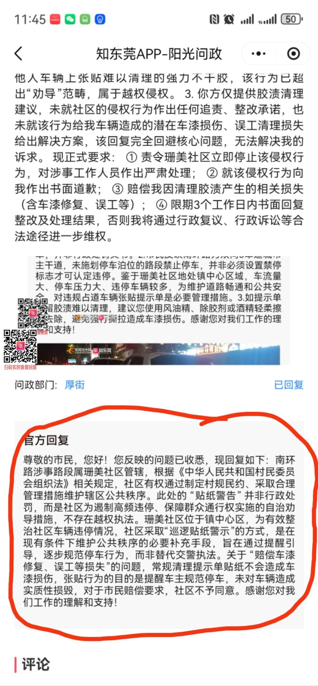 针对珊美社区本次回复,我认为其完全回避核心问题、混淆法律概念,未就我的诉求作出任何实质性回应,现再次明确我的意见与要求: 1. 珊美社区混淆“基层自治”与“侵权行为”的边界。根据《民法典》第二百零七条,私人的物权受法律平等保护,任何组织或个人不得侵犯。社区以《村民委员会组织法》为由,在私人车辆上粘贴强力不干胶贴纸,并非合法的“自治劝导措施”,而是对公民财产权的直接侵犯,该行为已超出社区自治权限,属于越权侵权,必须立即停止。 2. 珊美社区以“常规清理不会造成车漆损伤”为由,拒绝承担责任,完全无视客观事实。该不干胶贴纸难以清理,我为清除胶渍已产生额外的误工、清洁费用,且存在车漆刮花的风险,这些损失均由社区的侵权行为直接导致,社区必须承担相应的赔偿责任,而非以“未实质损毁”为由推诿。 3. 我此前提出的“责令停止侵权、书面道歉、赔偿损失、限期书面回复整改结果”四项诉求,社区本次回复均未正面回应,也未作出任何整改承诺。现再次要求: ① 责令珊美社区立即停止在私人车辆上粘贴强力不干胶贴纸的侵权行为; ② 就该侵权行为向我作出书面道歉; ③ 就我因清理胶渍产生的相关损失(含车漆修复、误工、清洁费等)出具明确的解决方案; ④ 请厚街镇主管部门介入监督,限期3个工作日内书面回复整改及处理结果。 若仍未收到有效回复,我将依法通过行政复议、行政诉讼等途径维护自身合法权益,并向东莞市纪委监委、信访部门反映该社区推诿扯皮、侵害群众合法权益的行为。