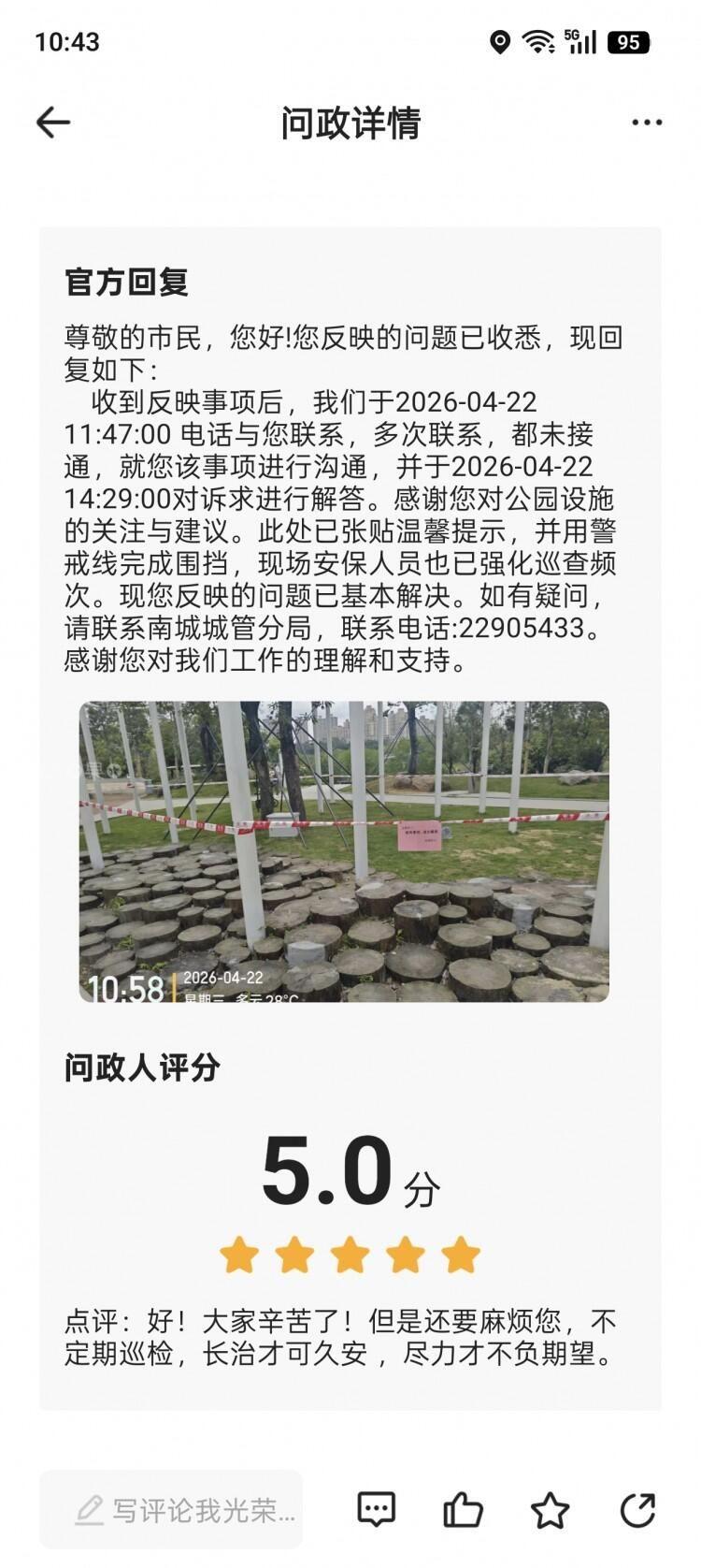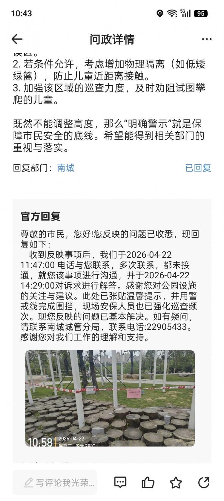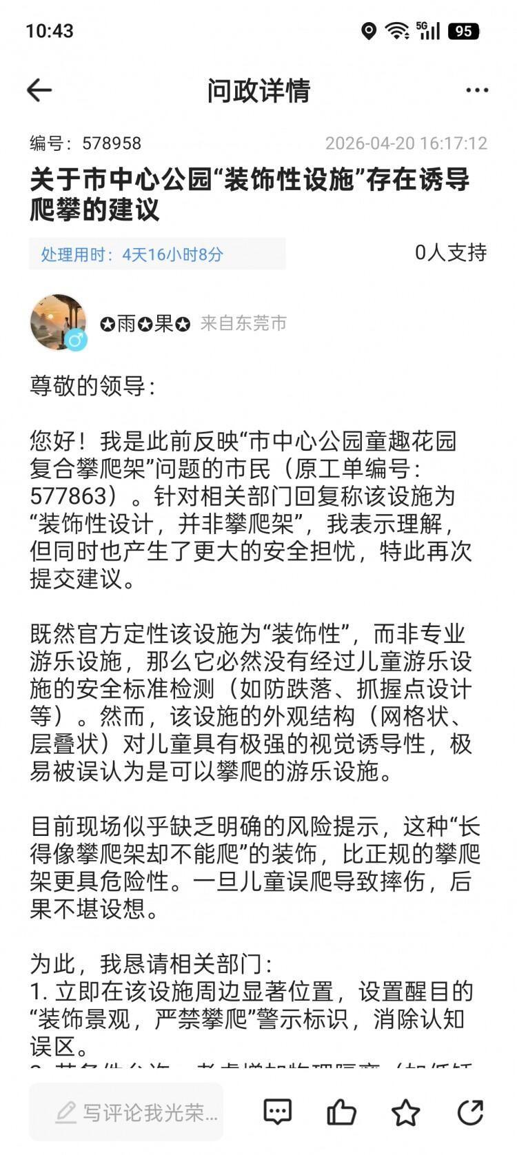 市民“较真”消除隐患,我为东莞速度点赞 今天必须给咱们东莞的市民和相关部门都点个大大的赞! 起因是市中心公园童趣花园有个“复合攀爬架”,看着特别像游乐设施,但官方定性其实是“装饰性设计”。这就带来了一个巨大的安全隐患:孩子天生爱爬高,万一误以为是游乐设施爬上去摔下来怎么办? 一位非常有责任心的市民(原工单577863)再次提交了建议,逻辑清晰、有理有据:既然不能爬,那就得有明显的警示,甚至物理隔离,消除这种“诱导性”的危险。 结果如何?东莞速度杠杠的! 收到反馈后,南城城管分局迅速行动:不仅张贴了醒目的“温馨提示”,还用警戒线把区域围了起来,安保人员也加强了巡查。 从市民敏锐发现问题、专业提出建议,到部门迅速响应、立行立改,这才是城市共治的美好模样! 安全隐患无小事,为这位细心的市民点赞,也为高效的职能部门点赞!👍 东莞正能量 #城市治理 #安全隐患 #市民建议 #东莞速度
