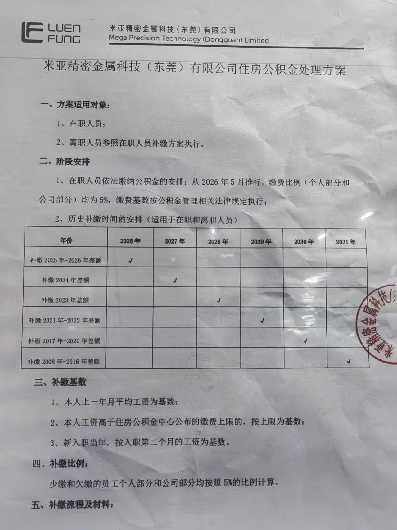 1. 明确反对转为“集体协商”:要求公积金中心将本人案件转为个案立案,不与其他员工案件合并处理; 2. 反对“6年分期”方案:要求责令公司在法定期限内(一般为1-3个月)一次性完成补缴,不接受任何形式的分期方案; 3. 追缴全部应缴金额:要求公司按照本人实际工资作为缴存基数,按法定比例(5%-12%)补缴在职期间的全部公积金; 住房公积金是职工的基本住房保障,是法律赋予劳动者的强制性权利,不容任何形式的“协商分期”变相剥夺。米亚公司作为拥有17000余名员工的大型企业,长期不为底层员工足额缴纳公积金,已构成系统性违法。而东莞市住房公积金管理中心以“集体协商”为名中止个案处理,消极履行法定职责,更是对投诉职工合法权益的二次伤害。 6年分期,本质上是用时间换违法成本、用程序拖垮维权意志。这样的方案,不应被任何执法部门认可,更不应强加于不同意分期的职工身上。 恳请贵中心正视本人的投诉请求,依法履行职责,责令米亚公司限期一次性补缴全部欠缴公积金! 此致 东莞市住房公积金管理中心
