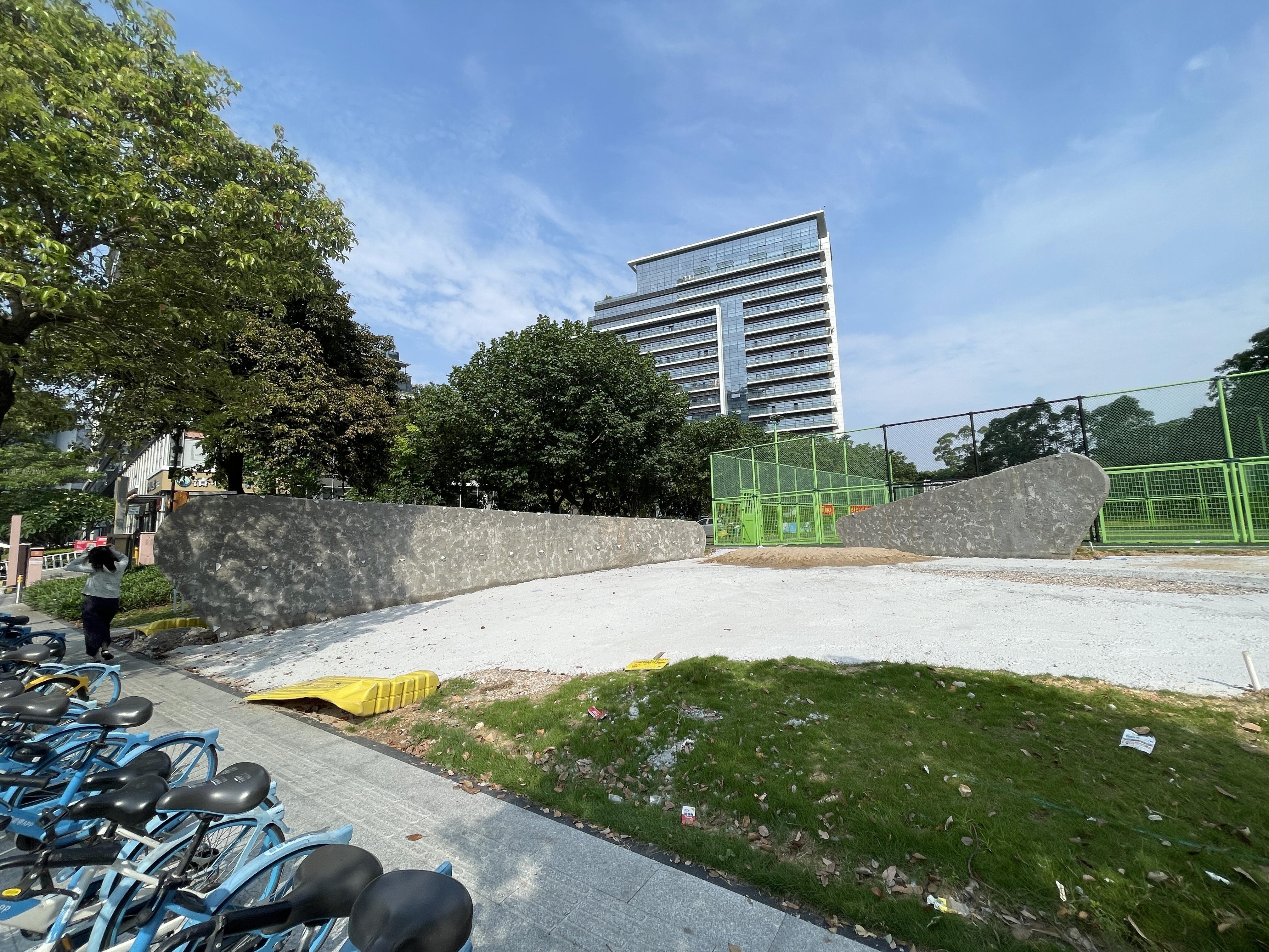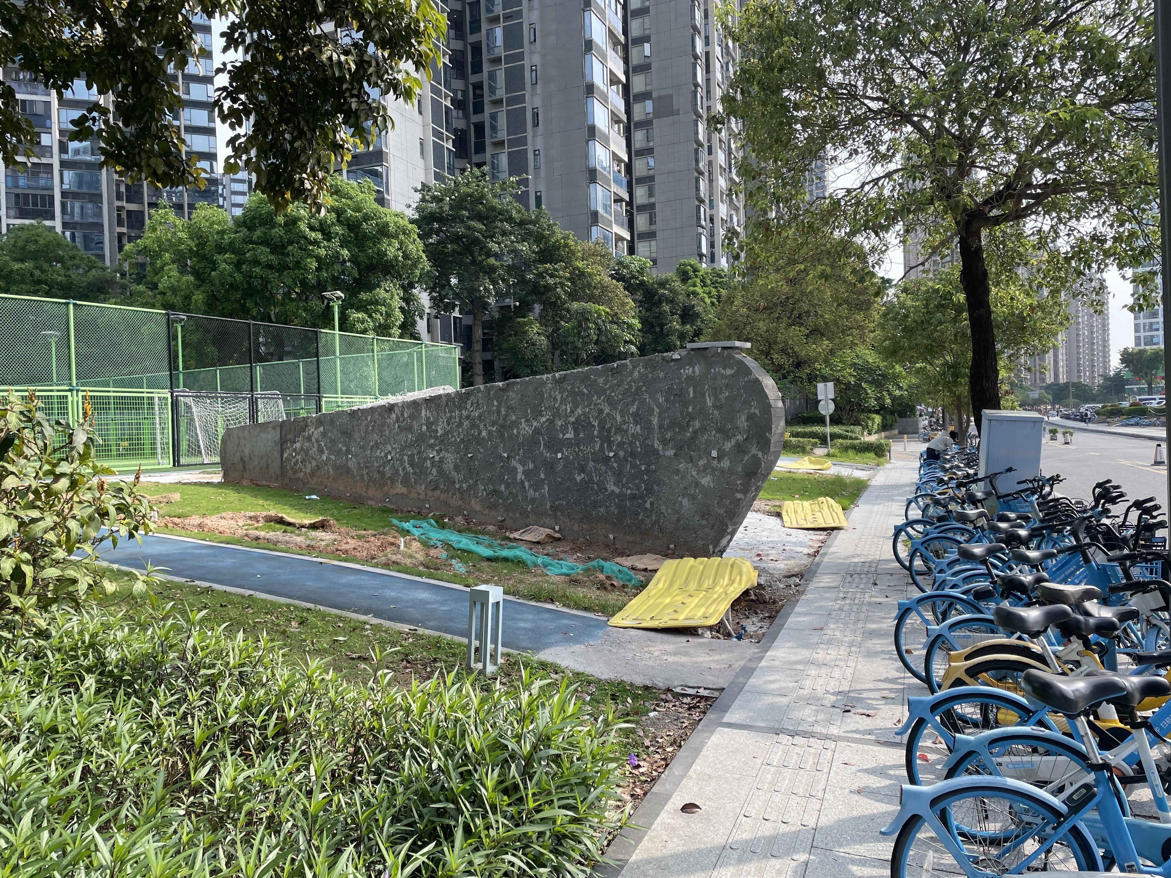 南城天安数码城C区足球场前立了2块水泥墙,路边停满共享单车,导致步行空间压缩,行人路过有时候还需要低头弯腰避开水泥墙,晚上灯光暗的话可能没看到水泥墙的一角而撞伤头部。