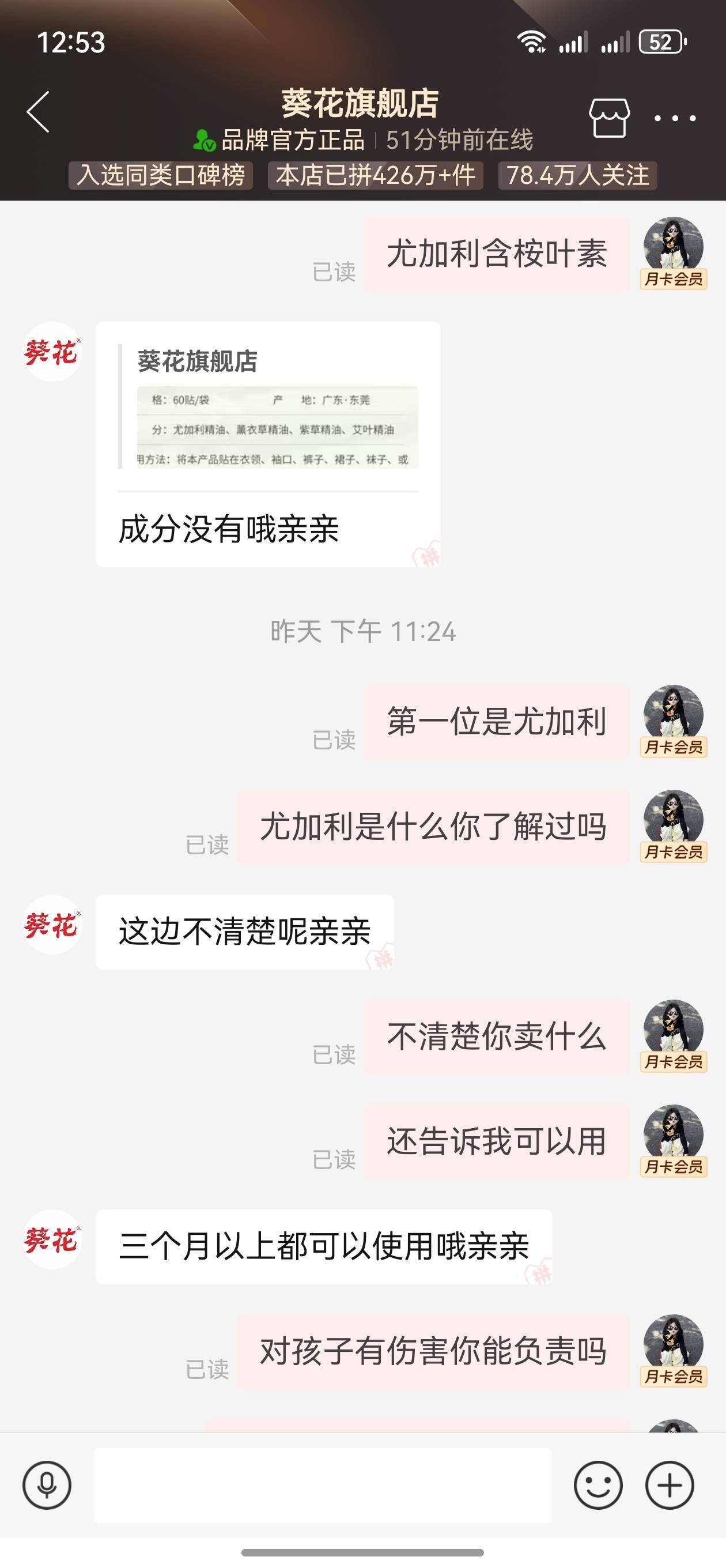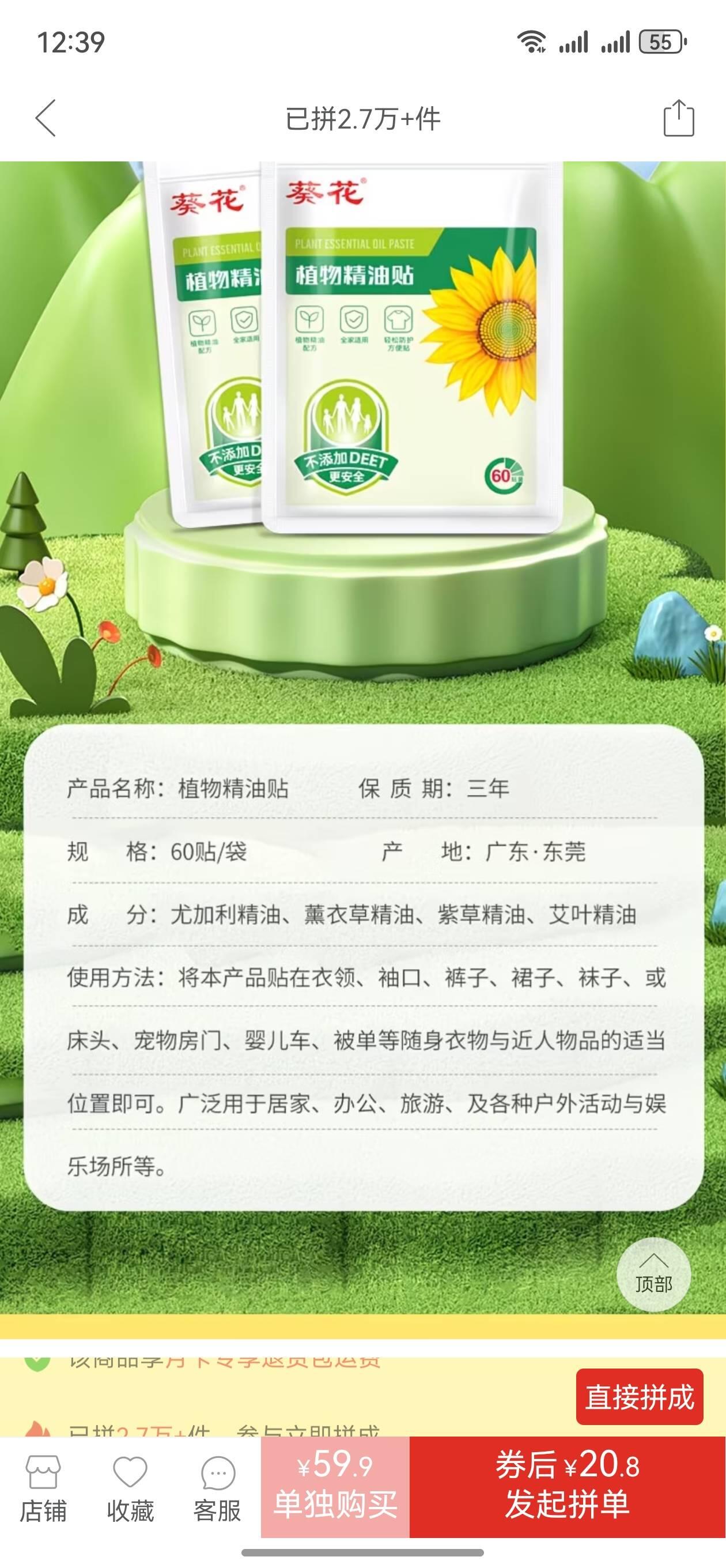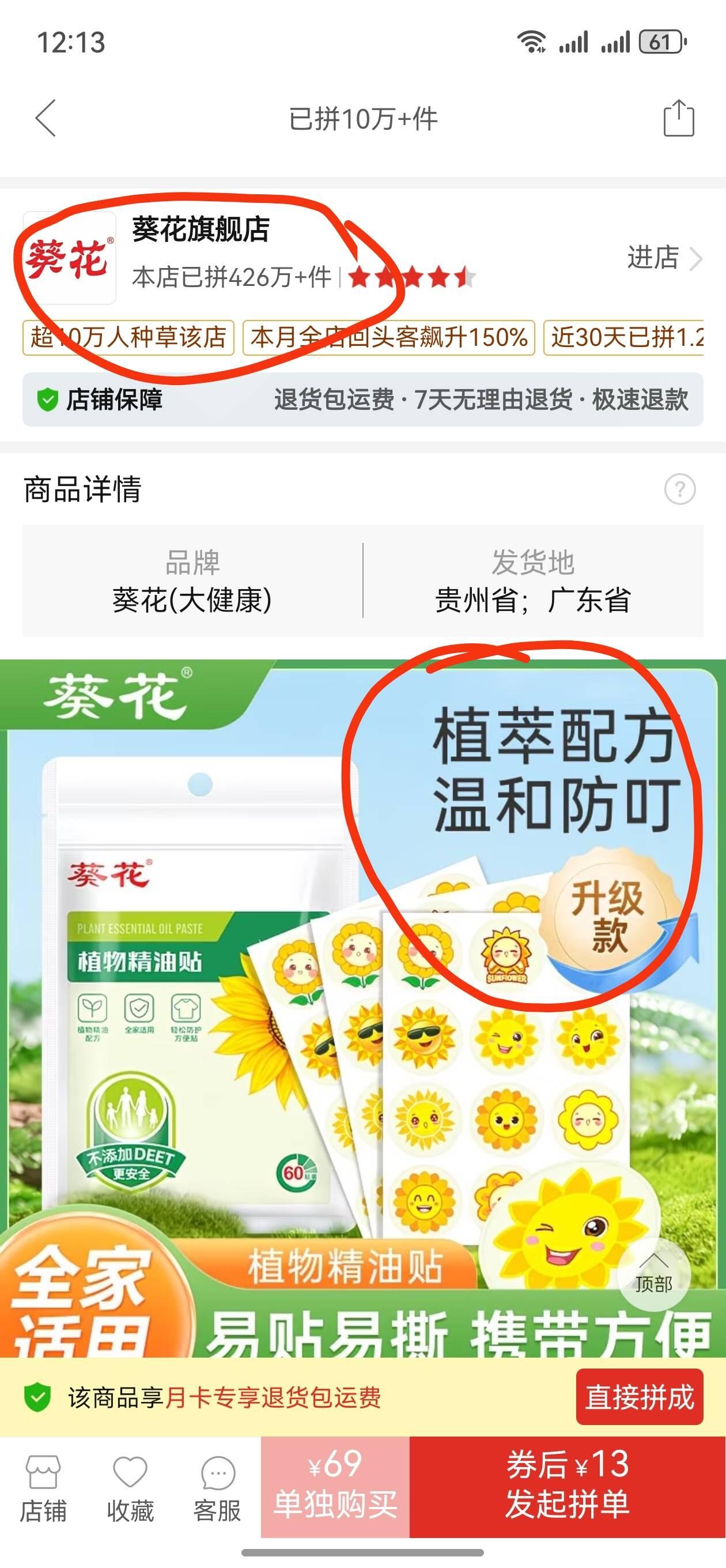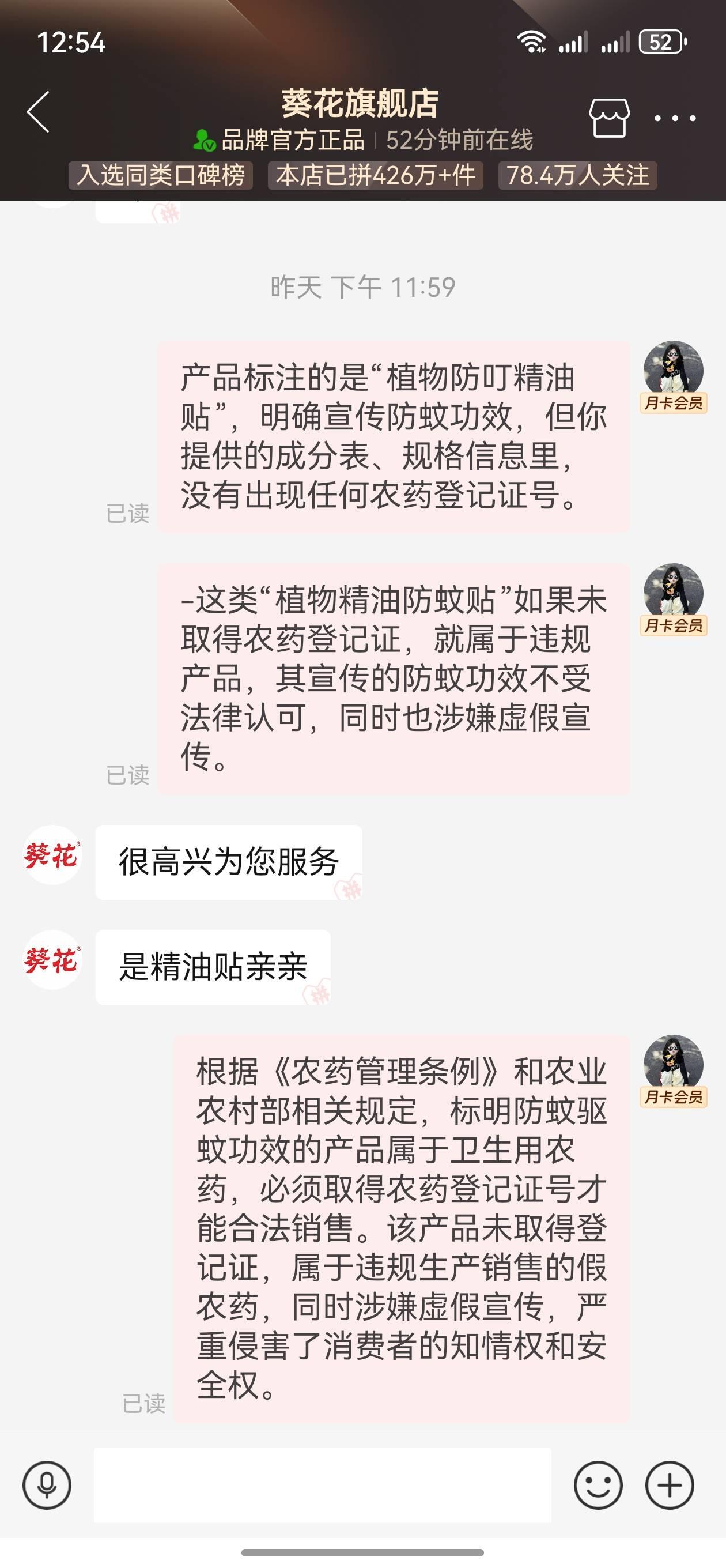 我在拼多多葵花旗舰店,买的葵花防叮精油贴,宣传防蚊功效却无农药登记证,属于无证销售假农药;且客服谎称不含桉叶油,实际成分含有,构成欺诈 1.产品明确宣传防蚊功效,属于卫生用农药范畴:该产品的商品详情页、宣传页明确标注“防叮”字样,宣传“轻松防护、”,第三方检测报告也专门检测了“蚊子趋避率”(结果87.6%),证明以驱避蚊虫为核心功效。根据《农药管理条例》及农业农村部相关规定,标明防蚊、防叮、蚊虫防护功效的产品,无论成分为精油还是化学物质,均属于卫生用农药,必须取得农业农村部核发的农药登记证号,农药生产许可证号才可合法生产、销售。 2.产品无任何农药登记证号,和农药生产许可证号,属于假农药:该产品的包装正反面均未标注任何以“WP/WL”开头的农药登记证号,仅标注了企业标准号 Q/JYSW007-2022 ,未取得农药登记证,和生产许可证依法应按假农药处理,商家的行为属于无证销售假农药,违反了《农药管理条例》第二十一条、第五十五条的规定。 3.商家提供的企业标准检测报告,不具备农药合规效力:商家提供的第三方检测报告,仅为按企业标准出具的普通质量检测报告,并非农业农村机构出具的农药登记法定试验报告,无法证明产品符合农药安全、药效的法定要求,不能替代农药登记证号。 4.故意隐瞒产品真实成分,作出虚假陈述:该产品包装背面成分表明确标注含有“柠檬桉精油(即桉叶油/尤加利精油)”,但本人购买后向店铺客服询问产品是否含桉叶油时,客服明确回复“成分没有哦亲亲”,作出虚假、误导性陈述,故意隐瞒产品真实成分。 5.虚假宣传产品安全性:商家宣传产品“全家适用、更安全”,但产品含有柠檬桉精油,且未取得农药登记证,和生产许可证,安全性、刺激性(尤其是对婴幼儿)未经过法定毒理测试,宣传内容与实际情况不符,属于虚假宣传。