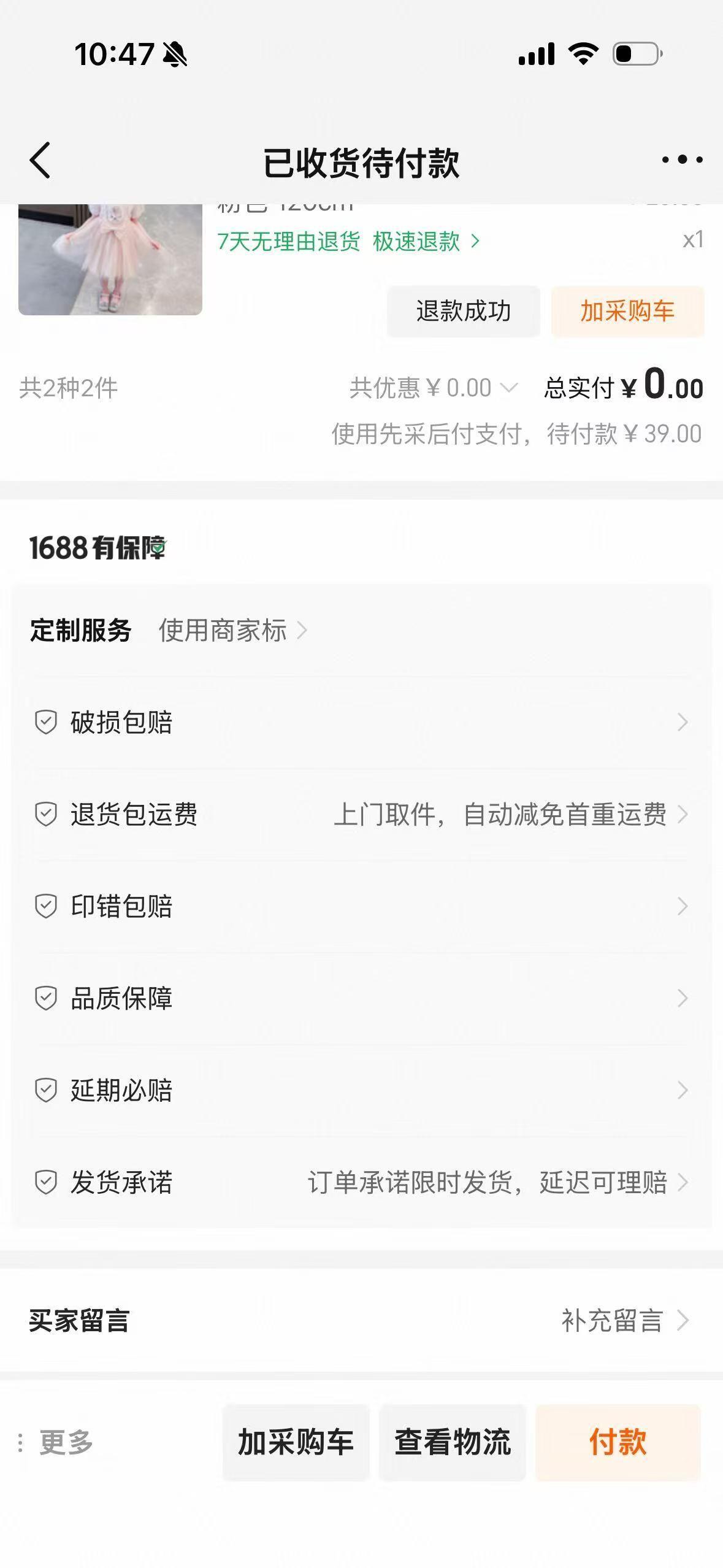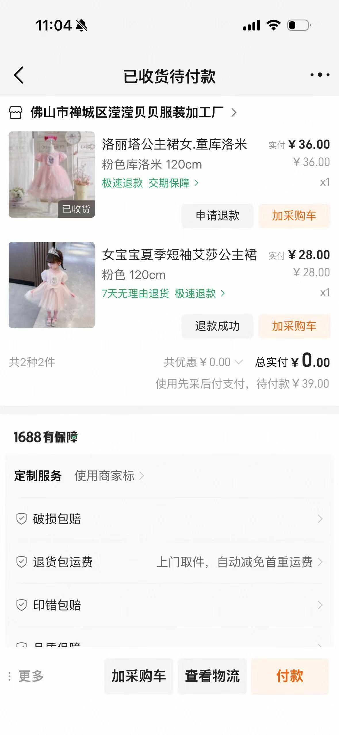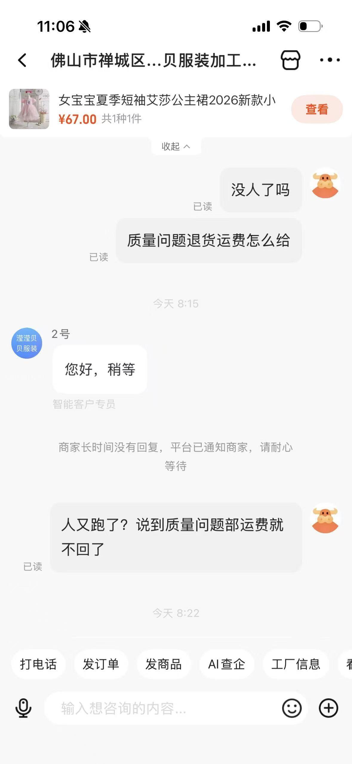 本人于2026年4月15日,在阿里巴巴旗下 佛山市禅城区滢滢贝贝服装加工厂 店铺购买一条裙子(商品名:洛丽塔公主裙女童 库洛米)。收货后发现商品存在严重问题: 1. 实物与页面宣传严重不符:裙子实物中间的图案跟详情页展示的款式、颜色不一致,存在虚假宣传。 2. 做工存在严重质量问题:裙下摆与裙纱错误缝合在一起,属于明显的做工瑕疵,看着很明显 发现问题后,我多次联系商家客服反馈,并提供了清晰的实物照片和对比图。商家仅同意退货退款,但对于退货运费由谁承担的问题,始终回避、拖延,不给予明确回复和处理方案。 根据《消费者权益保护法》及平台规则,因商品描述不符、质量问题导致的退货,运费应由商家(责任方)全额承担。商家此种推诿态度,严重损害消费者合法权益。 投诉诉求: 1. 要求平台对该店铺进行处罚,杜绝虚假宣传与劣质商品,督促改善售后处理态度 恳请平台协助维权,督促商家尽快妥善处理!2.要求赔偿金额36元