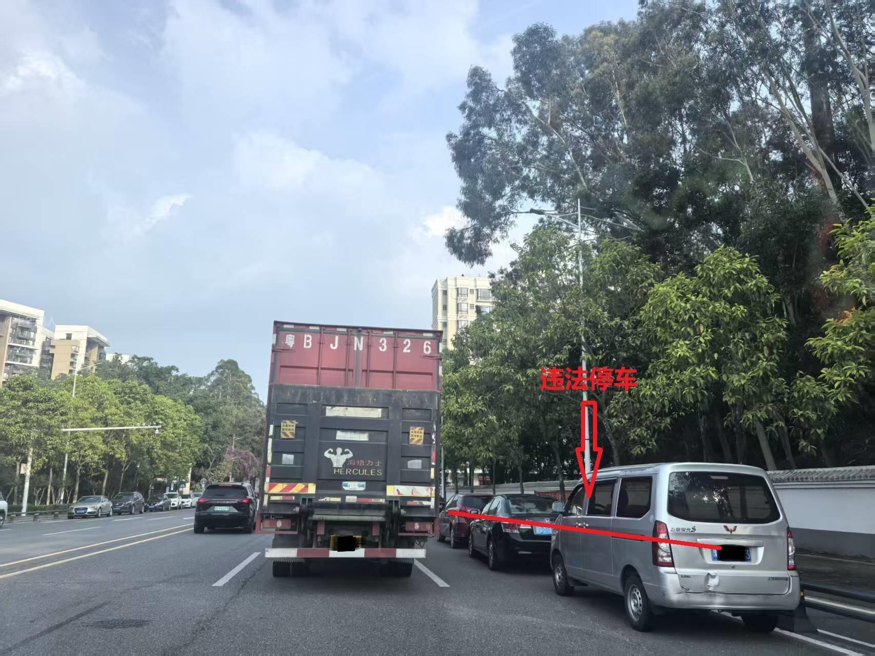 东莞市塘厦镇塘兴大道原本3车道路,旁边一侧转弯道路被违法车辆停放,严重影响交通出行,请相关部门对两边违法停放的车辆进行疏通及处罚,恢复道路畅通。