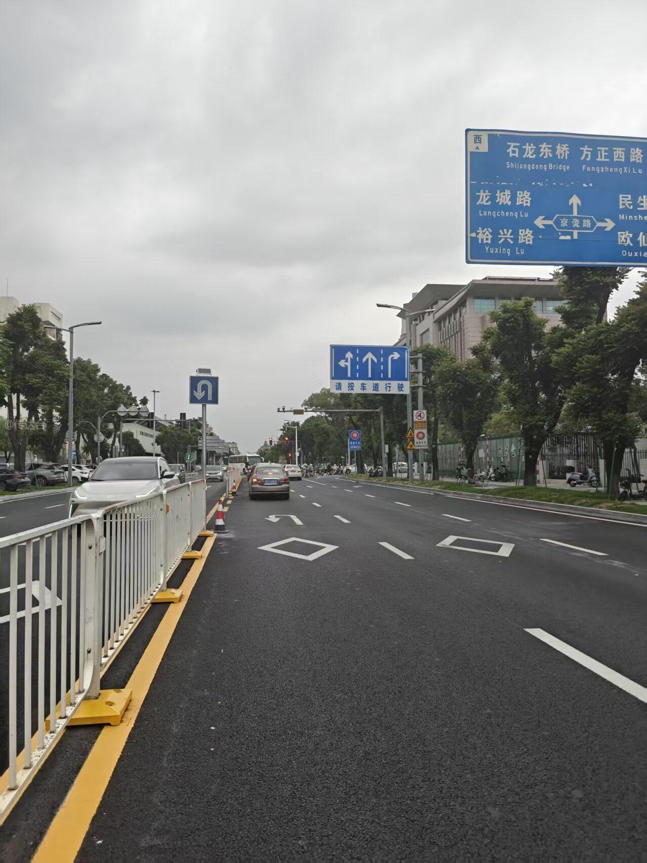 石龙交管大队、石龙镇公用事业服务中心: 您好! 我是石龙镇的市民,现就方正路(图片 1 所示路段,位于方圆路 园洲路方向,祥龙路与青林路交叉口附近)的交通设施设置问题,向贵部门提出优化建议。 一、当前路段存在的主要问题 图片 1 所示路段,道路中央全线设置了连续的隔离护栏,未设置可供车辆掉头的开口。车辆如需掉头,必须行驶至前方红绿灯路口完成。但在实际通行中,存在以下明显不便: 1.通行效率极低:当前方红绿灯路口有车辆等待转左行红灯时,所有需掉头的车辆均被迫排队等候,即使转左行车流较少,掉头车辆也无法提前完成操作,造成不必要的拥堵,严重影响道路通行效率。 2、出行体验差:该路段沿线有居民区、工商业区,日常车流量较大,单一的掉头点设置给市民日常通勤、出行带来了极大不便,未能体现 “以人民为中心” 的交通管理理念。 二、就图片1的优化参考方案 对比图片 2 中的方正中路的设计,该路段在隔离护栏中段增设了一处掉头开口,并配套了清晰的掉头指示标志。该设计带来了显著的改善效果: 1.无需再集中到红绿灯路口排队掉头,有效分散了车流,缓解了路口压力; 2.掉头车辆可在确保安全的前提下,直接通过开口完成掉头,大幅提升了通行效率; 3.清晰的标志引导也减少了违规行为,道路通行更加顺畅有序。 三、具体整改建议 为解决图片 1 路段的上述问题,恳请贵部门参考图片2的经验,对该路段进行优化整改: 1.增设掉头开口:在图片1所示的护栏中段位置(红框标注处),拆除3-4节隔离护栏,设置一处规范的掉头开口。 2.完善配套设施:在掉头开口处增设掉头指示标志,若条件允许,可配套设置专用掉头信号灯或减速让行标志,明确通行规则,保障掉头车辆与对向车辆的安全。 3.优化标线设计:在掉头开口前的路面施划导向箭头、停止线或让行线,引导车辆有序进入掉头区域,避免因标线不清引发混乱。