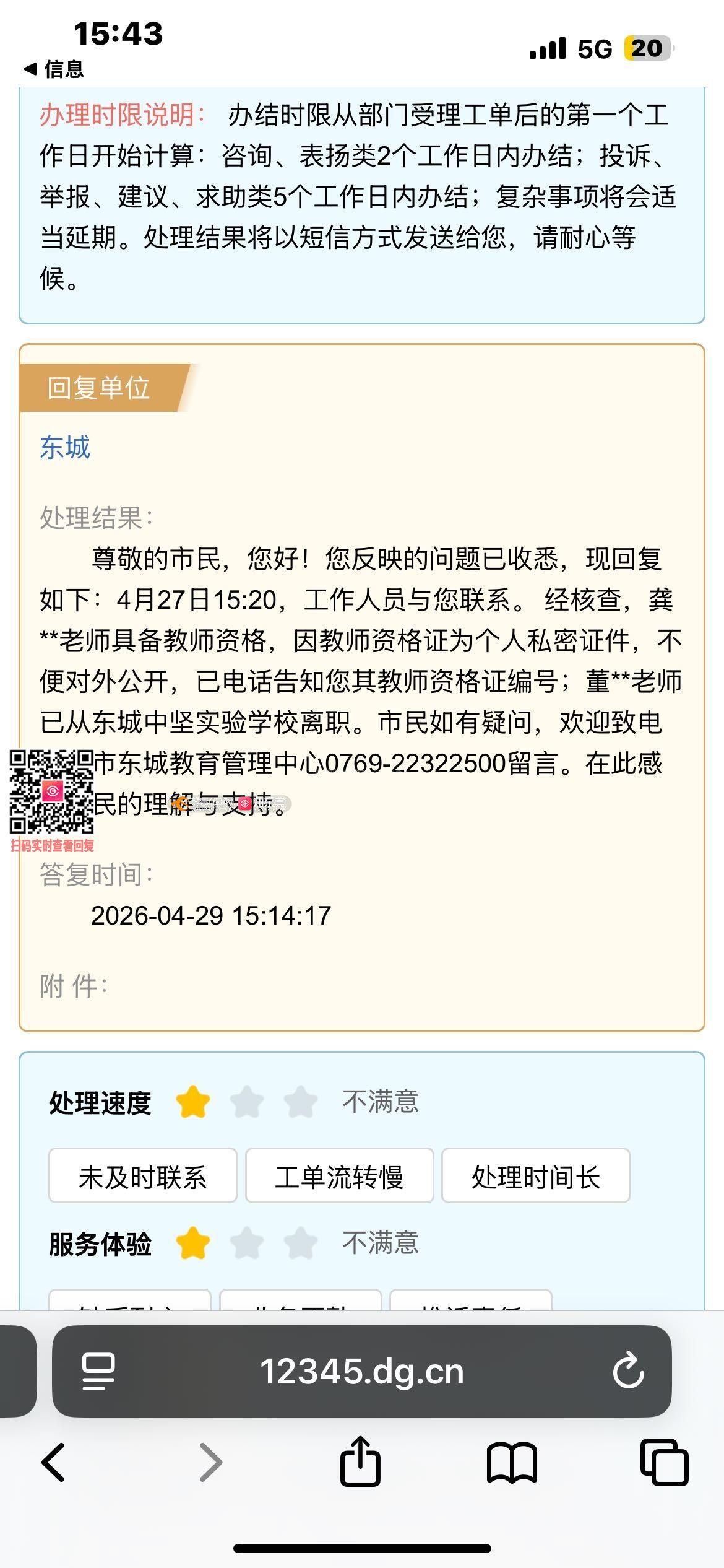 本人于2026年4月29日收到东城教育管理中心关于“教资查验”问题的回复 本人对此答复【评不满意】,理由及诉求如下: 一、问题焦点 诉求核心是查验东城中坚实验学校涉事教师(龚**)是否具备合法教师资格,而非仅听取口头告知。 二、不满意的理由 东城教管中心仅通过电话口头告知“具备教师资格”,称“因个人隐私不便公开证书编号”,实际未提供任何可核实、可验证的官方证明。在孩子被该教师殴打致“突发性耳聋”的严重情节下,我有权确认施暴者是否具备法定从业资格。口头告知缺乏公信力,无法消除我的合理怀疑。 三、具体诉求 现要求东城教管中心重新核查并提供以下可验证的证明材料之一: 1. 官方查询截图:在“中国教师资格网”(或省市教育部门官网)查询该教师资格证信息的官方截图; 2. 书面复函:发证机关(杭州市教育局)针对此事的书面核查复函; 3. 文件副本:教师资格证认定表的复印件(可隐去手机号、住址等敏感信息,但必须保留证书编号及官方验证方式)。 ✅✅