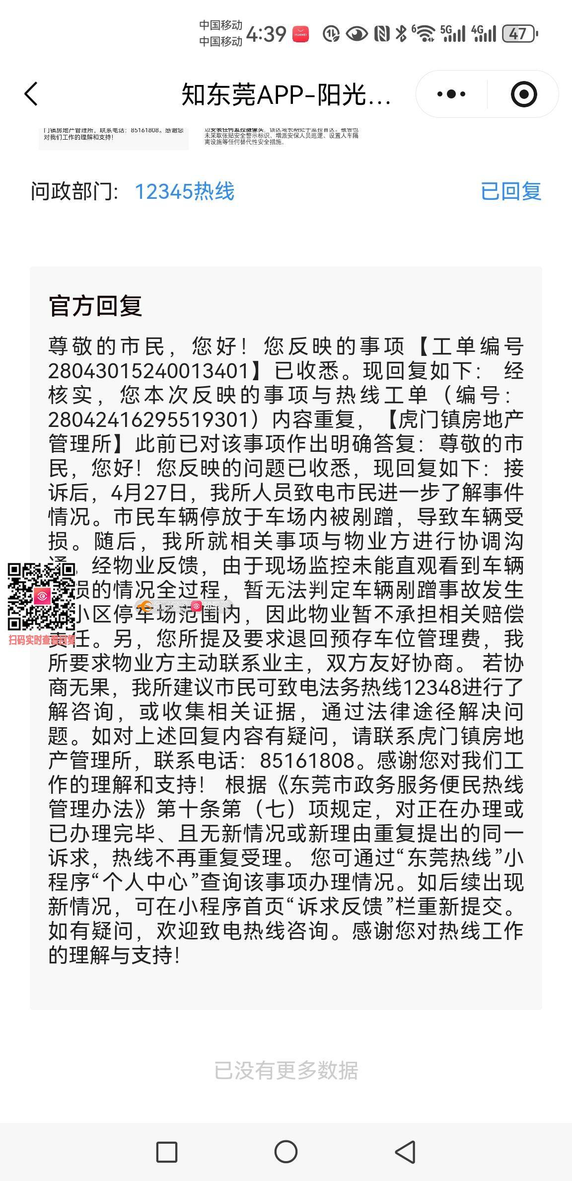 尊敬的市民,您好!您反映的事项【工单编号28043017005778901】已收悉。现回复如下: 经核实,您本次反映的事项与热线工单(编号:28042416295519301)内容重复,【虎门镇房地产管理所】此前已对该事项作出明确答复:接诉后,4月27日,我所人员致电市民进一步了解事件情况。市民车辆停放于车场内被剐蹭,导致车辆受损。随后,我所就相关事项与物业方进行协调沟通。经物业反馈,由于现场监控未能直观看到车辆被损的情况全过程,暂无法判定车辆剐蹭事故发生在小区停车场范围内,因此物业暂不承担相关赔偿责任。另,您所提及要求退回预存车位管理费,我所要求物业方主动联系业主,双方友好协商。 若协商无果,我所建议市民可致电法务热线12348进行了解咨询,或收集相关证据,通过法律途径解决问题。如对上述回复内容有疑问,请联系虎门镇房地产管理所,联系电话:85161808。感谢您对我们工作的理解和支持! 根据《东莞市政务服务便民热线管理办法》第十条第(七)项规定,对正在办理或已办理完毕、且无新情况或新理由重复提出的同一诉求,热线不再重复受理。 感谢您对热线工作的理解与支持!