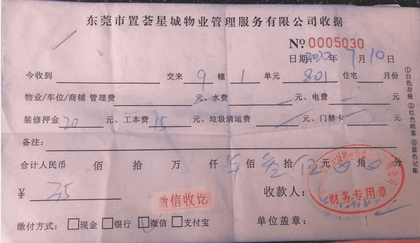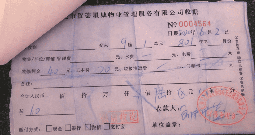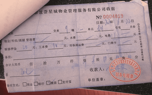星河国际花园物业在业主装修房子时,除了收取3020装修押金及5元工本费外,还先后6次收取装修工人押金及工本费(下附收据)。收款时都说好押金部分是可以退款的,现在装修完成后延误要求退款时,备受阻挠,物业不承认收据上面写的押金部分可以退款。