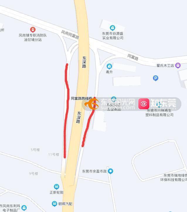 如图红线所示位置 早上 g220国道 同富路 区域上下高架引线段 左右两侧 经常停靠大货车影响交通 天天如此希望查处