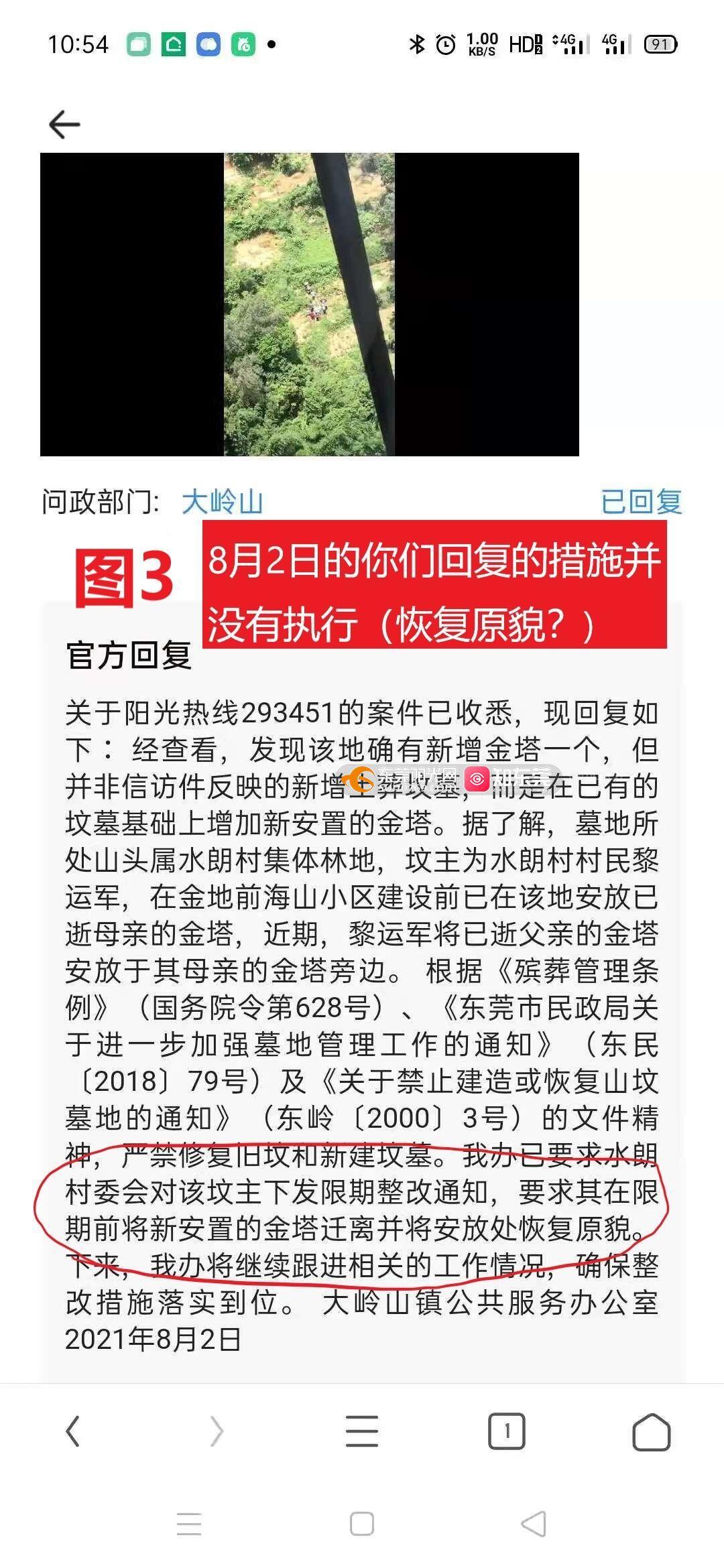 尊敬的相关领导:上次我们反馈过金地前海山西侧那座山有新增坟墓的现象,你们也派人过来调查了,的确有新安置金塔的现象并要求恢复原貌(见图3你们8月2日的回复),但很遗憾,不但不恢复原貌,10月24号我们又发现新增坟墓的现象,情况特别夸张(如图1,图片种至少有6座坟墓)。另,据高层邻居反馈,在山顶上的图2的位置也新增的坟墓。请相关负责领导亲自到现场调查及走访附近村委村干部,了解清楚以下问题并给予我们具体答复: 1)目前西侧那座山靠近金地居民楼这边究竟有多少处旧墓地?分别分布在哪些地方?要先了解清楚旧墓地,才能杜绝新增的问题,否则村民新增的墓地却谎称为旧墓地 2)2021.8.2你们答复的恢复原貌的新增金塔什么时候可以恢复原貌?以及这次新增的坟墓什么时候恢复原貌? 3)目前存在的旧墓地是否允许他们过节时修缮?如果允许,是否可以要求墓地亲人们在前面种些高树木以遮挡?或者采取其他方法遮挡,以免影响高层居民的居住舒适度及心情。 4)山顶上(图2)新增坟墓主人是谁?对于非法新增坟墓问题,请问目前处罚措施是什么?针对目前这附近不断新增坟墓的现象,是否考虑加重处罚? 请负责领导们在百忙之中抽出一点时间认真调查走访,还我们一份天然无比的绿水青山,非常感谢!