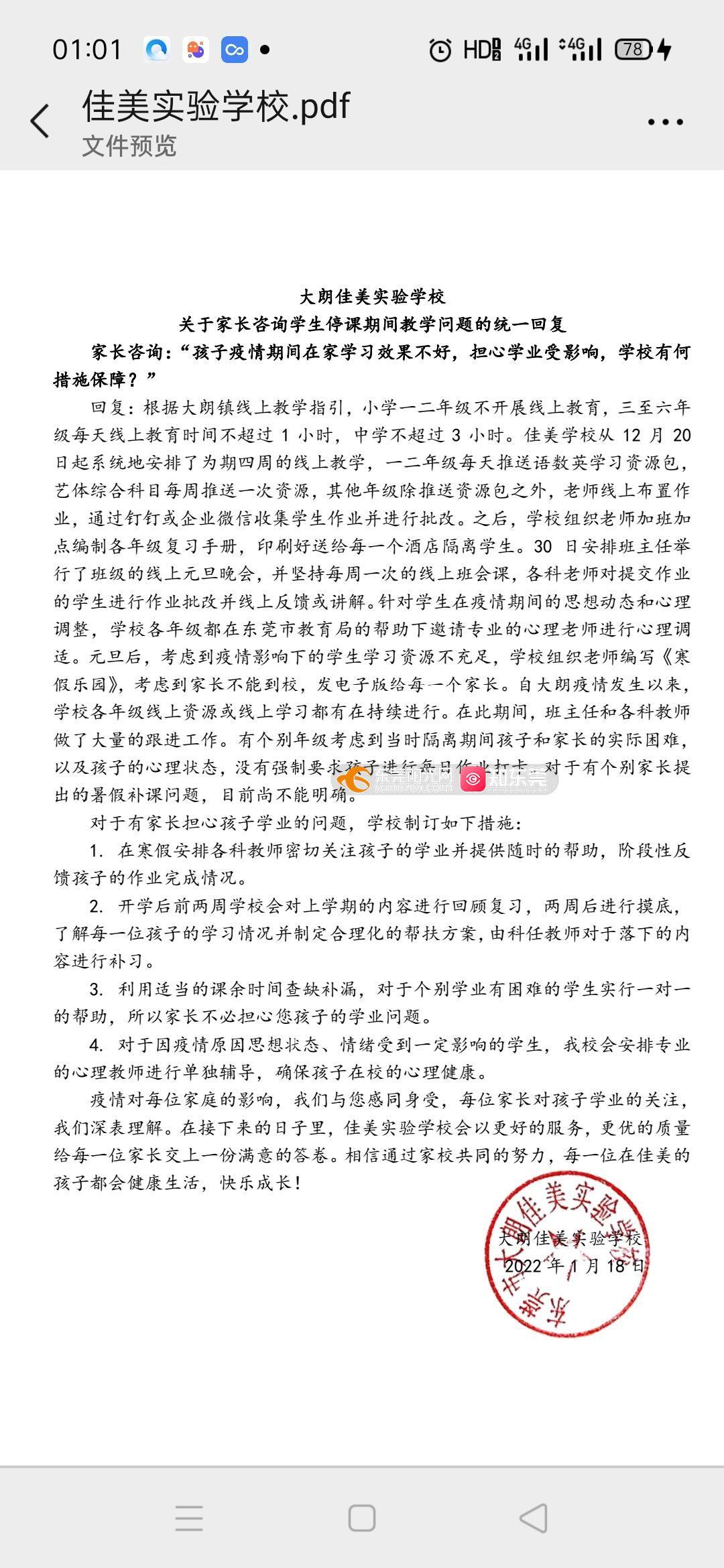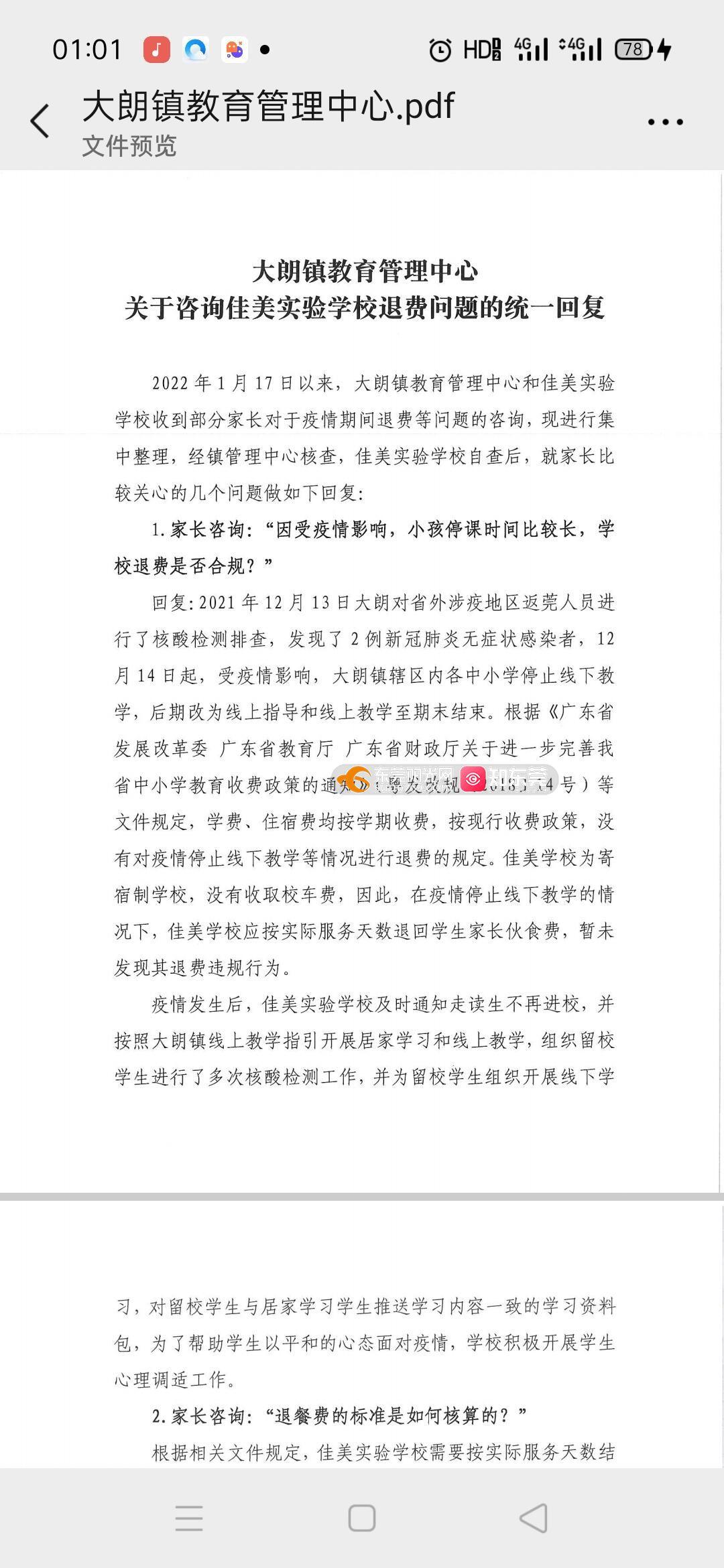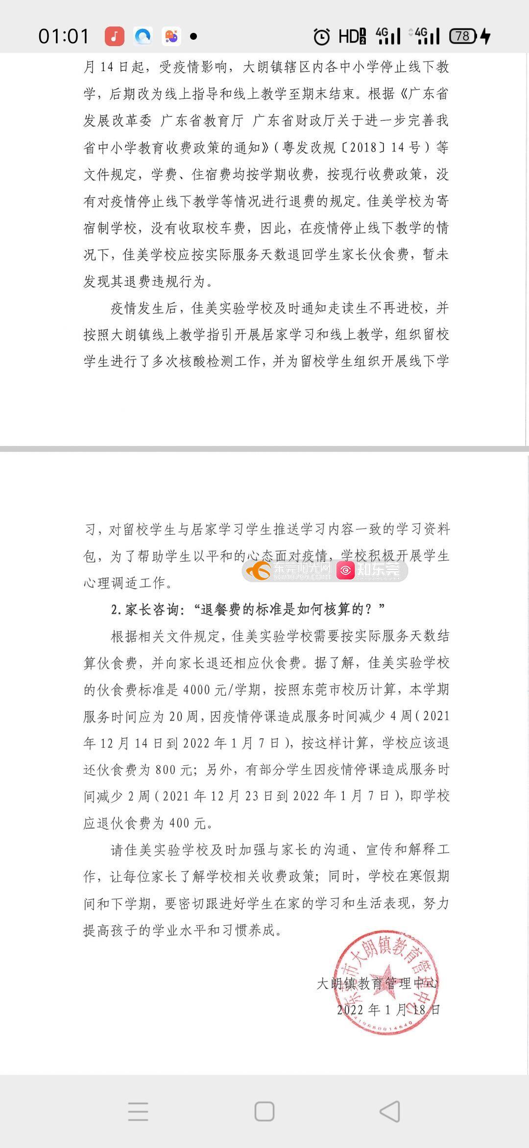 市教育局针对大朗疫情期间学生被隔离停课执行的退费标准按照2018年的退费标准执行,2018还没有发生疫情,所针对的停课对象也不是被迫停课,情形怎能相提并论,2020年省教育部针对新冠疫情有颁发退费标准,为什么仍按照2018年执行 ,2018年针对学生主观退学休学停课,和受新冠疫情影响,导致学生被迫隔离停课,性质完全不同。如以下图五所示(该图为老师提供,称本次退费符合此执行标准),标红线下方,该条明确指出,因疾病退学,应按照被教育者在校时间清算住宿费,我们本就是因为传染病新冠疫情停课,为何还要收取不在校期间的住宿费。因学校发生疫情,全家被居家或酒店隔离,本来经济上就遭受了巨大损失,学校还要收隔离期间的住宿费全校师生都被隔离,本校老师没有开展网课,只有不定时转发的几个教学视频,低年级甚至政策上本不允许上网,如此大打折扣的教学方式,却还要按照已完成线上教育标准,被收取全额学费,如何能是有理可循,有法可依
