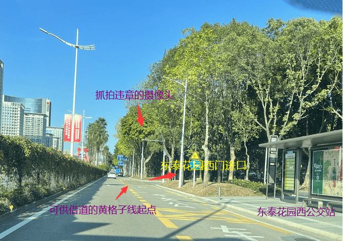 家住东泰花园,最近很多邻居收到在东泰花园西路段借道公交专用道行驶已被记录的提醒。 从东莞大道辅道进入东泰花园西门,临近路口公交专用道才有黄格子线提供借道,顶上就是违章抓拍摄像头。如果遵照规定从黄格子借道右转,必须大大减速然后观察右边公交道情况后再转直角弯进去,高峰期肯定会造成后面车辆堵塞。 这条辅道承载东莞大道、四环路前往东泰花园、凯旋城和怡丰路方向车流,以及提供四环路车辆进入东莞大道主道,高峰期车流量巨大。 公交车在东泰花园西只有86路、27路、G11路和微巴1路,前面三条路线均为长线,车次间隔大,这段专用线道路利用率十分低下。如果因为右转进入东泰花园、凯旋城等需临近路口再停车或者减速观察等待借道右转,高峰期造成拥堵,可能造成四环路去东莞大道的车流下不来,阻滞效应如果延伸到东莞大道主道,还会影响东莞大道进入四环路往景湖路口方向的车流,得不偿失。 建议延长黄格子线长度,能提前借道右转,或者取消四环路到怡丰路之间的公交专用道,这样才是合理利用道路,减轻拥堵压力。