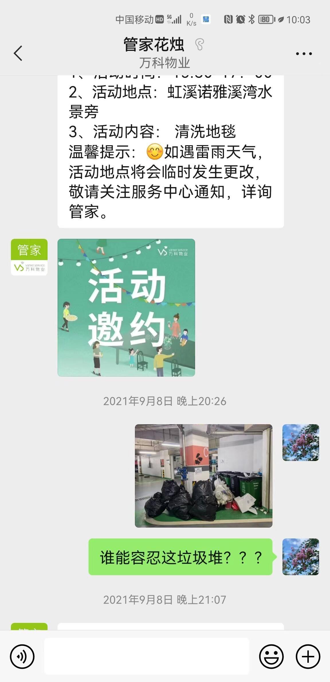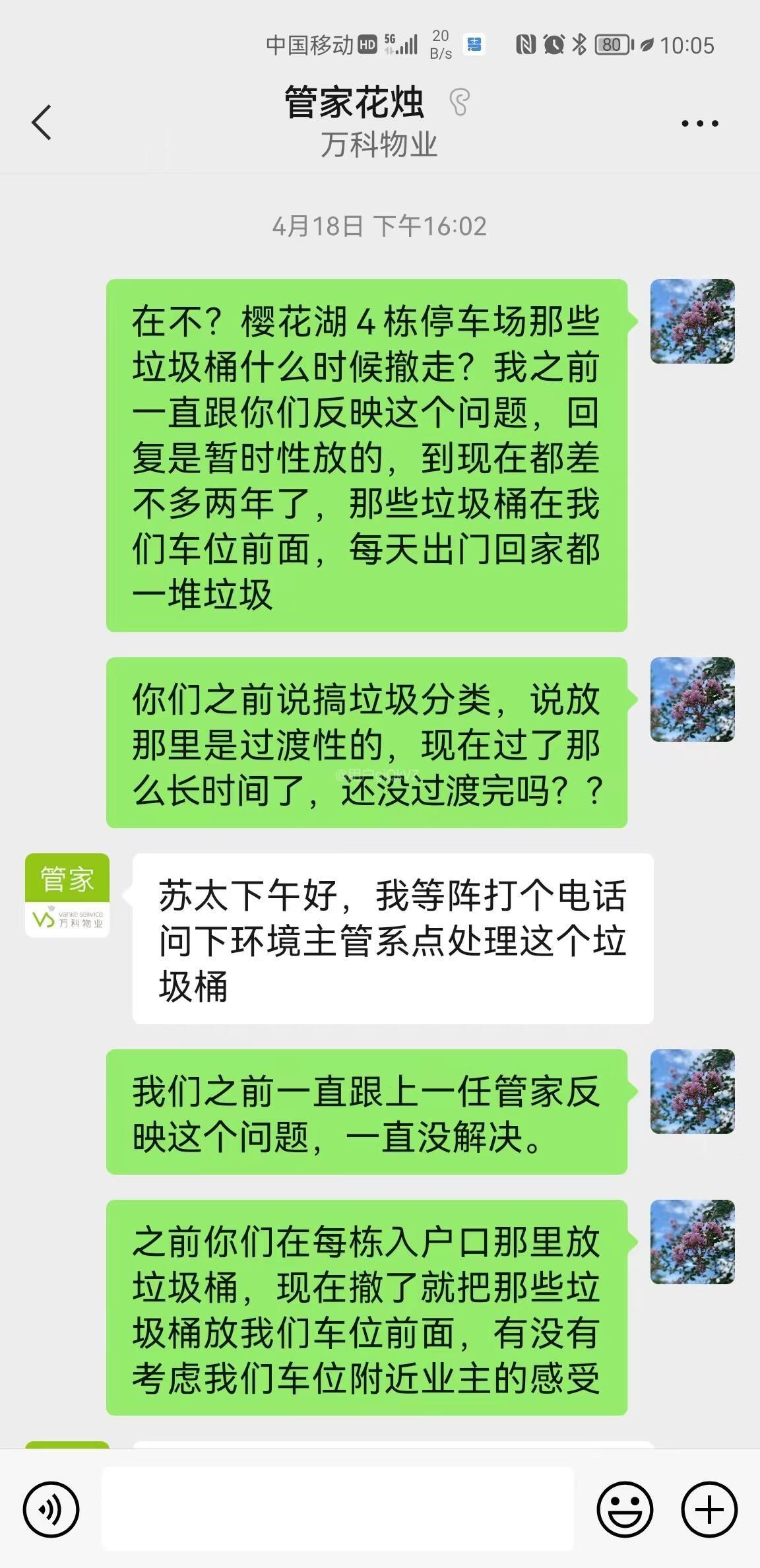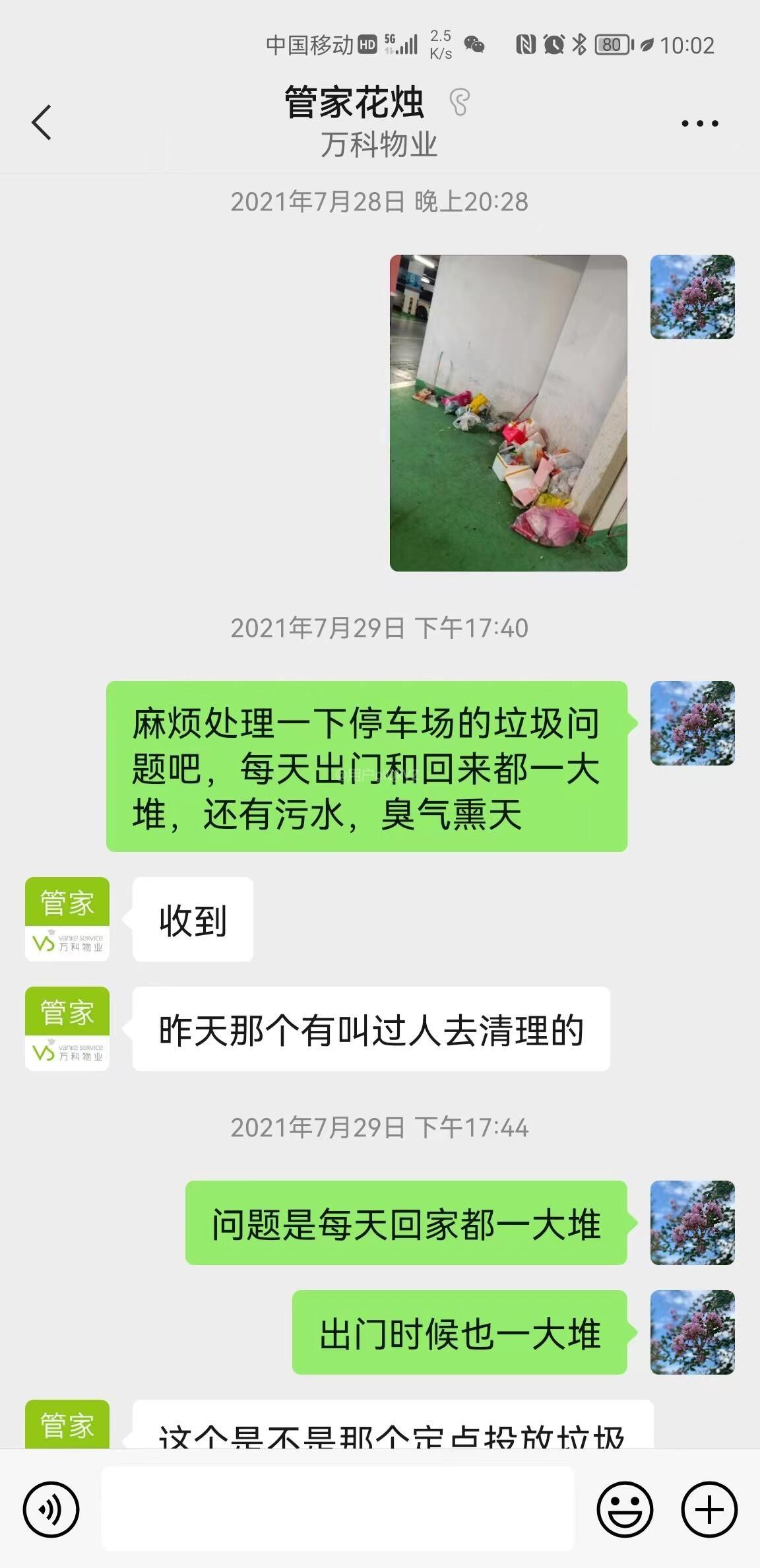 1.2020年年底,万科物业借实施垃圾分类为由,撤走原先摆放在地下停车场每栋入户的垃圾桶,然后不顾周围车位业主的反对,在地下停车场随便找地方摆放垃圾桶。再以垃圾分类过渡期为由,一再拖延撤走地下停车库的垃圾桶。 2. 地下停车库垃圾桶旁的地上经常堆满垃圾,污水横流,严重影响周边停车位的环境。 3.现在是疫情防控非常时期,在地下停车场这样密不透风的地方摆放这么多垃圾桶,容易滋生蚊虫、细菌和病毒,引发公众卫生问题。 4.在地下停产库随便摆放的这些垃圾桶根本不符合垃圾分类政策的要求,小区大部分业主为贪图方便把大量的生活垃圾直接往地下车库的垃圾桶投放,地面上的垃圾分类投放点实质是为了迎合上级部门的检查而设,垃圾分类完全没有效果。 5.强烈要求万科物业尽快撤走地下停车库的所有垃圾桶,还周边车位业主一个干净整洁的环境!