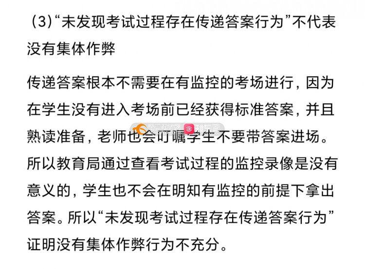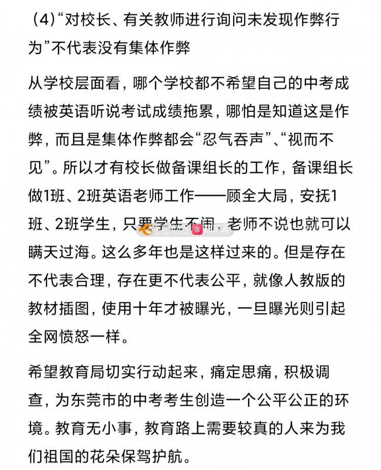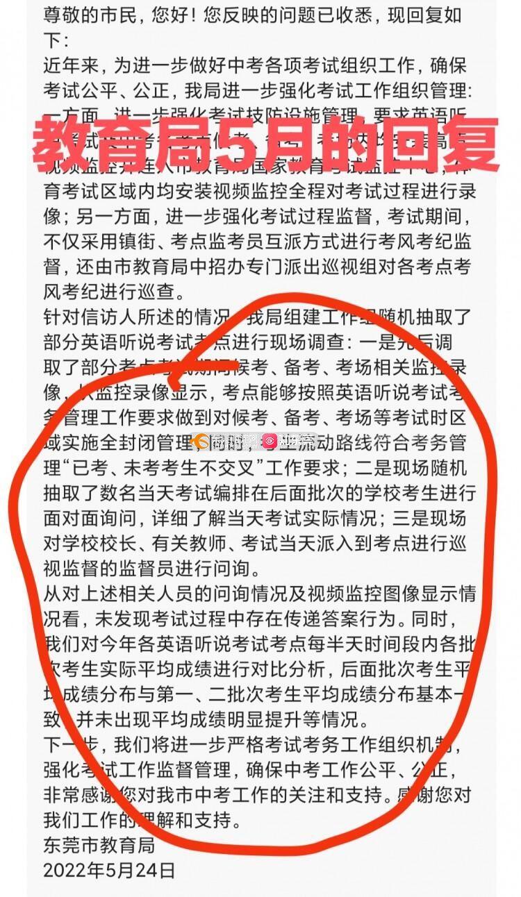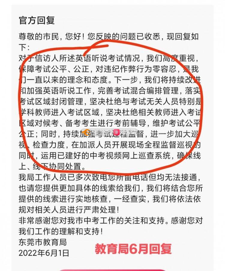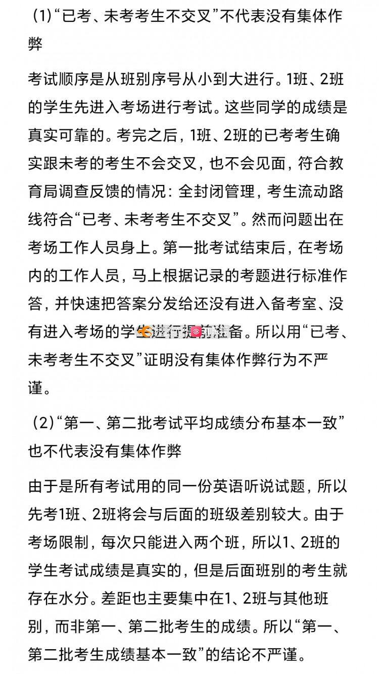 (由于字数限制,不能显示的内容将以图片的形式呈现) 中考已经成为全城瞩目的大事件,其重要性一点不亚于高考,甚至超越高考,直接决定一个还未成年的孩子未来三年的直接走向。中考竞争也已经进入白热化,几分可能就让一个孩子无缘优质高中,甚至是无缘于高中。中考英语听说满分30分,其公平性不言而喻。东莞英语中考听说考试多年一直存在班号小的先考,考完后标准答案就由英语老师做好后分发给后考的班别的同学,以致对班号小的班别(特别是1班、2班)的学生有着严重不公。为了保证以后中考英语听说考试的公平公正,教育局相关部门必须高度重视,加强管理,改变目前听说考试的乱象。其实高考的听说考试就做得非常好,希望中考英语听说积极参照高考标准。根据目前的乱象,本人提出以下建议,希望教育局相关部门积极自查,实现有则改之无则加勉。 1.全级考生随机打乱,混合编排考试批次和试室。 2022年之前的中考英语听说考试,都是按班别序号从小到大顺序进入考场。譬如,1班、2班的考生永远都是第一批进入考场,第一批进行考试。考场内只有同班同学或者只有1班和2班的同学,还没有实现“考试混合编排”。建议从2023年开始,参考高考听说考试。同一学校的考试考场号、座位号由电脑随机、及时产生。一旦产生立即拷贝封存,市纪委、纪检监察组进行全程监督并备份原始数据,杜绝人工干预。 2.建议采用完善听说考试题库,进行随机出题。如果为了保证试题难度,不能实现从题库随机出题,也应该同一套考题,打乱考题的先后顺序和答案顺序,杜绝考场集体作弊行为。 3.坚决杜绝由上至下的集体作弊行为发生,以下调查结果可能会得到错误的结论,建议教育局相关人员再仔细思考。 (1)“已考、未考考生不交叉”不代表没有集体作弊 考试顺序是从班别序号从小到大进行。1班、2班的学生先进入考场进行考试。这些同学的成绩是真实可靠的。考完之后,1班、2班的已考考生确实跟未考的考生不会交叉,也不会见面,符合教育局调查反馈的情况:全封闭管理,考生流动路线符合“已考、未考考生不交叉”。然而问题出在考场工作人员身上。第一批考试结束后,在考场内的工作人员,马上根据记录的考题进行标准作答,并快速把答案分发给还没有进入备考室、没有进入考场的学生进行提前准备。所以用“已考、未考考生不交叉”证明没有集体作弊行为不严谨。 (2)“第一、第二批考试平均成绩分布基本一致”也不代表没有集体作弊 由于是所有考试用的
