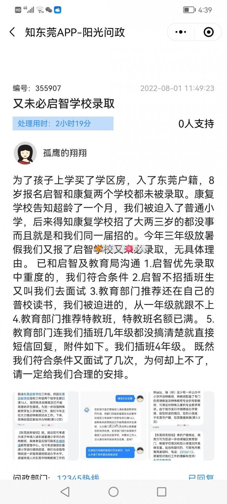 尊敬的市民,您好!您反映的问题已收悉,现回复如下: 目前,启智学校四年级的插班学位不足,无法接收您小孩的申请,鉴于您小孩已在东城三小随班就读,启智学校建议您的小孩回到原校继续随班就读。目前我市为解决特殊学校学位不足的问题,要求各园区、镇街均设立一个特教班,您可以向东城街道教育管理中心了解特教班办班情况并申请入读。如尚有疑问的,可致电市教育局基信科,电话:23126112。感谢您对我们工作的理解和支持! 为做好疫情防控,请戴好口罩。