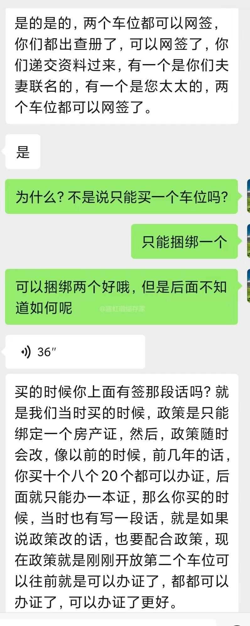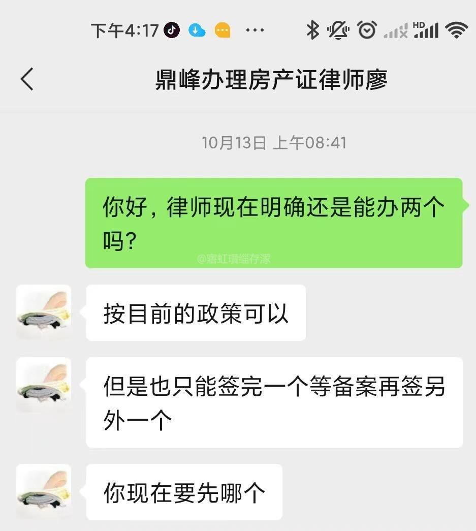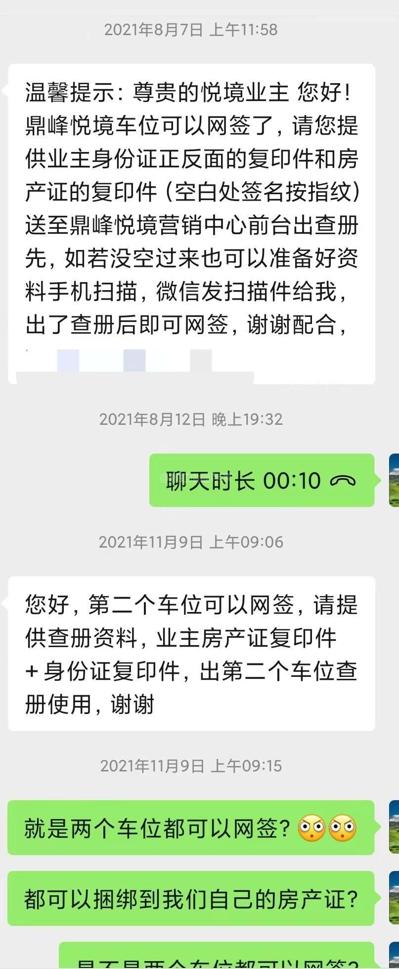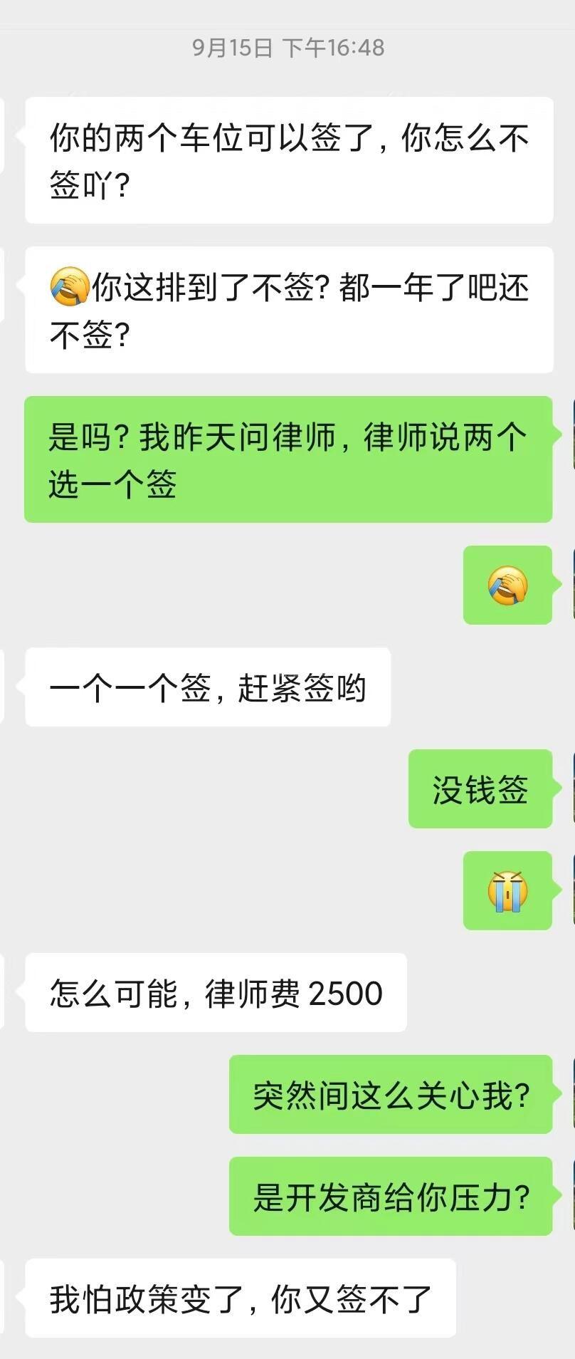 市领导,您好,由于本人2020年已一次性付款购买了两个产权车位,两年多过去了,产权证未办理,最近开发商要求我先选其中一个车位办理产权证,办理一个后再办理第二个(鼎峰车位有2000个,住户约1000户)。现恳请市领导帮忙解决困难: 一、网签,开发商强制收取律师费1200元代办,两个车位2400元,称需要律师才能网签,变相收费。请问网签本应该是开发商的义务,怎么变成一个要挟收费的项目?本人只需要开发商完成他们那边的义务,网签和提供购车合同和发票,我本人拿着这些资料去交税,办理产权证。需要委托律师。 二、是否可以办理第二个车位证,据咨询得(貌似是房管所),由于我们小区车位有2000个左右,住户有1000户左右达到一定比例,所以可以办理两个车位得产权证,避免后面继续“卡要”,墙督促开发商办理完第一个车位,后继续办理第二个车位得产权证。律师说只有两个星期时间,本人车位已经原始备案,超出时间又要重新操作,太烦心了。附上与鼎峰律师和销售的聊天记录。
