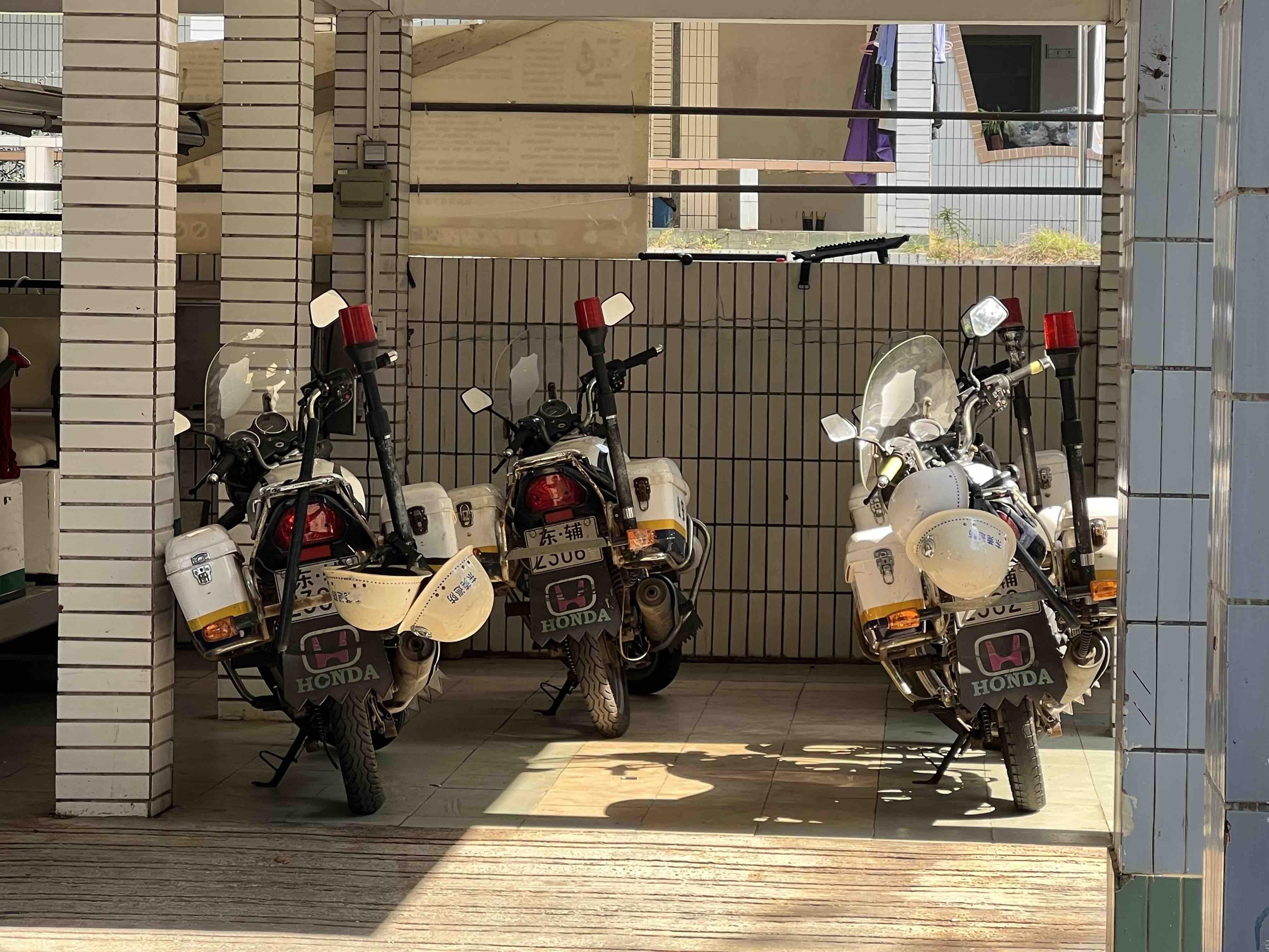 如图,在东莞市公安局东城分局立新派出所黄旗林场警务联络点内,有若干警用摩托车未按规定悬挂警用号牌。 《警车管理规定》第七条 警车号牌分为汽车、摩托车两种。均为铝质材,底色为白底反光。号牌应当符合《警车号牌式样》和机动车号牌的行业标准。