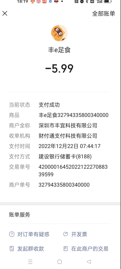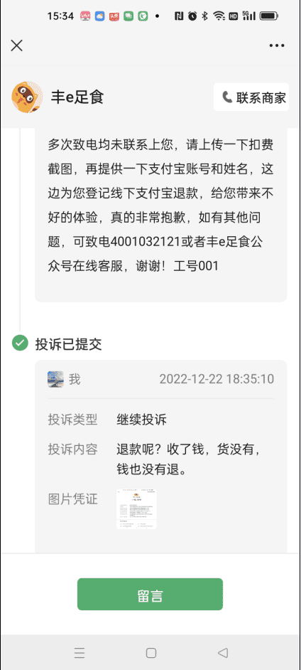 投诉丰E足食能量站商业销售不诚信,存在诈骗行为,金额5.99元。 电话4001032121. 2022年12月22日上午7点44分,在东莞市工人文化宫的自动销售机器上,付款购买了1瓶东鹏特饮。价格是5.99元,后没有出货物。于是打电话过去登记,大致的经过如下:在12月22日4001032121晚上来电,说有专人跟踪处理,说已经退款了,叫我查收一下。经查收,发现并没有退款。并明确告知没有退款。 12月23日,再次致电反映退款问题,又说没有收到我的上传记录。我说已经上传了,并提供了证明。 12月23日,说退款,要求提供支付宝账号和姓名。我买一瓶饮料,凭什么提供支付宝和姓名给你呢?!你丰E足食有权利叫客人提供支付宝账号,姓名,还有联系电话? 于是我多次要求将收款原路返回即可!然后,商家并没有处理! 请市有关部门协调解决。