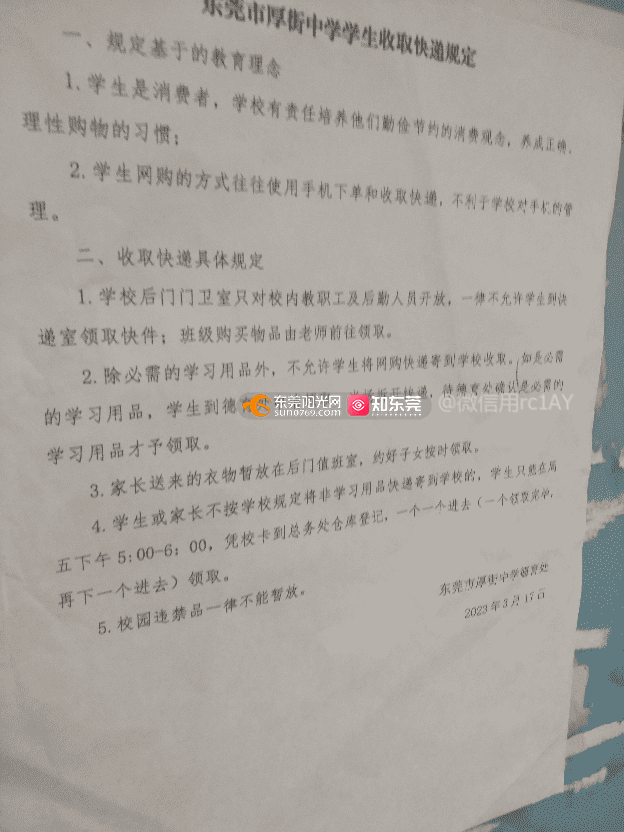 最近厚街中学又作了关于收快递和外卖问题的措施我认为有以下几点需要投诉并让其修改 其一,关于外卖问题。学校规定家长送吃的和外卖要在周日两点之前。这就很不合理。学校让学生在学校这么久的时间,家长想见见孩子送送温暖本是人之常情。现强制规定时间我认为这跟监狱探监没有什么区别。这不仅限制了家长与学生的时间,也导致一些家长因时间不协调从而无法与孩子见面这是不合理的地方之一。 其二,关于外卖问题。我认为是个人长期吃同样的东西都会腻吧?偶尔换换口味吃下外卖有错吗?学校认识为外卖不卫生,那学校饭堂偶尔出现的那些奇奇怪怪的东西我也不知道说什么好了。要是饭堂能很好满足学生需求,那学生还用吃外卖吗?另一方面,学生点外卖还有原因是家长没有时间送温暖,作为一个孩子看到别人有其他吃的自己没有肯定会去想点外卖满足自己的缺失。我认为这也是人之常情。 关于快递,快递太多确实影响学校管理。但大多数快递都是生活物品。学校嫌快递多,但如果不是学校要让学生在学校住这么久,学生用得着买这么多快递吗?拿快递的要求也更离奇。第一,学校要学生当场拆开快递,我认为这侵犯了学生的隐私权。第二,学校说平时拿快递拆开如果不是学习用品就不能拿走。试向问学校,那是紧急的生活物资怎么办呢?比如洗洁清,泡面那些学生急用的,这也不给拿吗?第三,学校规定其他物品只能周五下午5点至6点拿。学校一直号召要学生争分夺秒学习,但,让我们排队拿快递,这不是浪费我们学习的时间吗?而且一个小时确定拿得完?真的有点搞笑了,这是我认为最不合理的规定。 总结学校一直让学生和家长体谅他们,但他们却一直做着伤害学生和家长感情的事情。希望学校取消上述规定,或者修改让其更加合理和更具可操作性