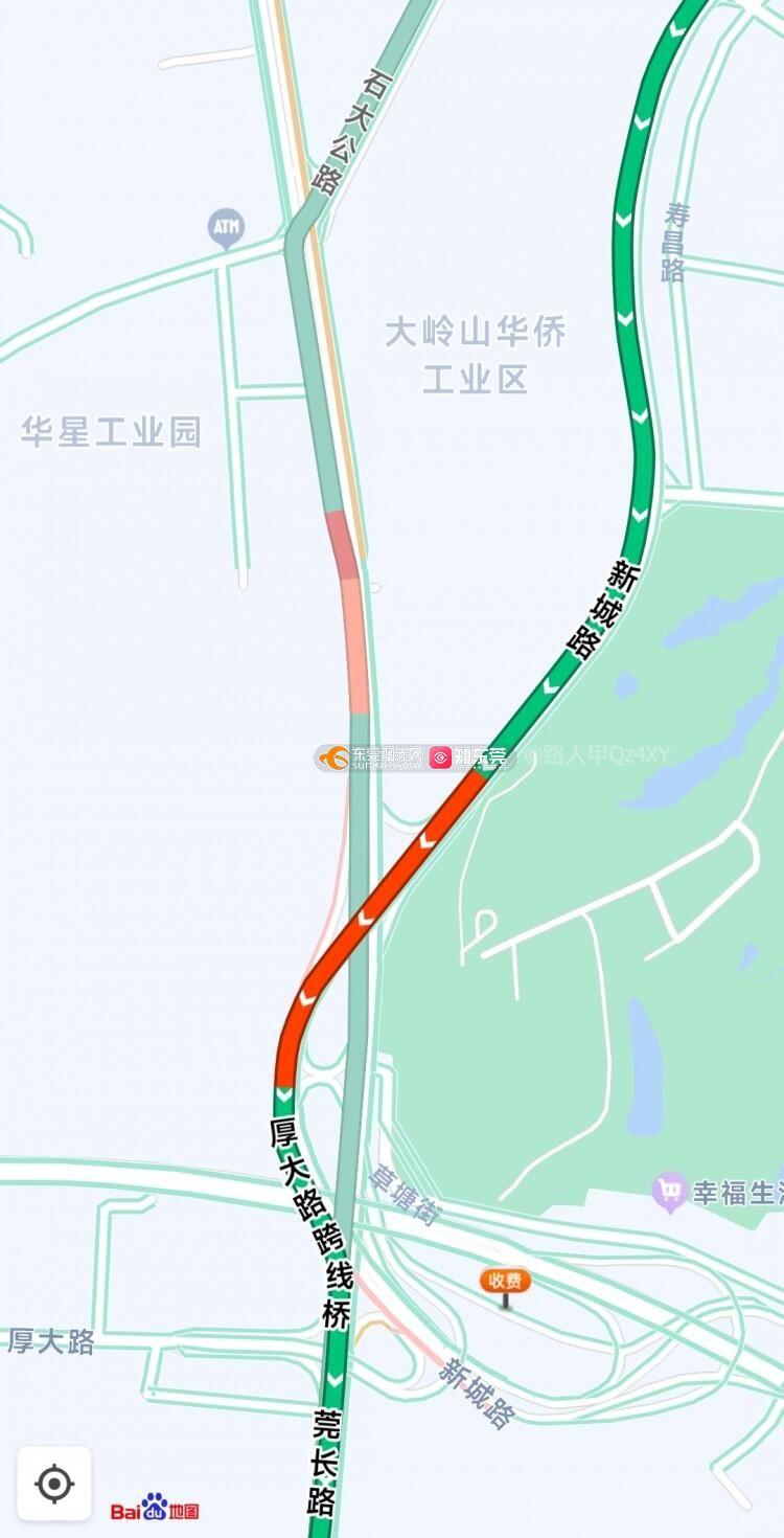 从松山湖新城路往厚大路跨线桥这段路,常年堵车,白天堵车,晚上堵车,各种汽车争先恐后四处乱钻很容易发生事故,新城路通往厚大路跨线桥这段很有必要安装红绿灯才能解决问题,安装红绿灯并且安装闯红灯拍照,这样才能解决问题